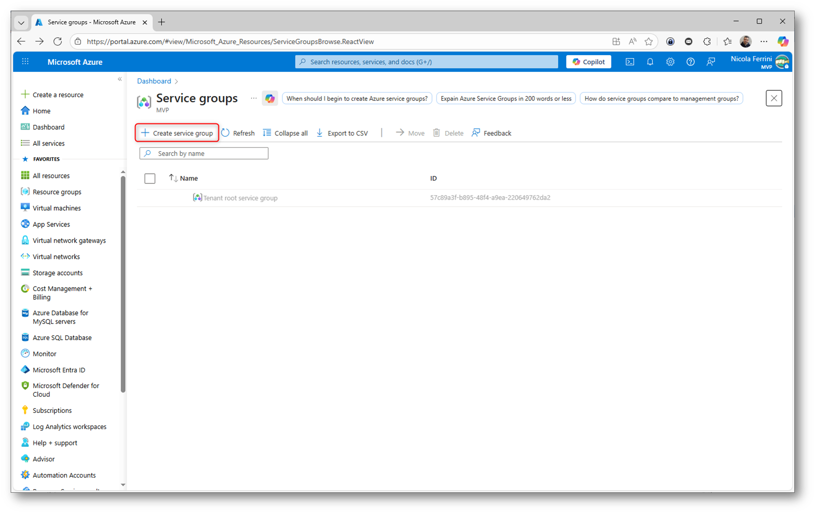 Figura 2: Schermata iniziale dei Service Groups nel portale Azure, con il pulsante “Create service group” per avviare la creazione di un nuovo Service Group