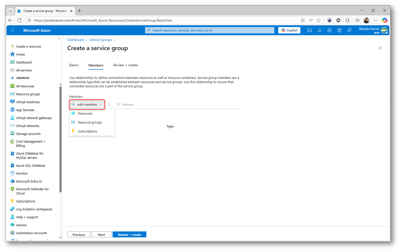 Figura 4: Sezione Members della creazione di un Service Group, utilizzata per associare risorse, Resource Group o sottoscrizioni al servizio