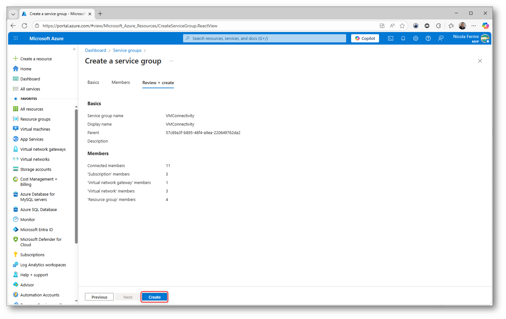 Verificate il riepilogo delle informazioni configurate, inclusi i dettagli di base e il numero di membri associati, prima di confermare definitivamente la creazione del Service Group tramite il pulsante Create.