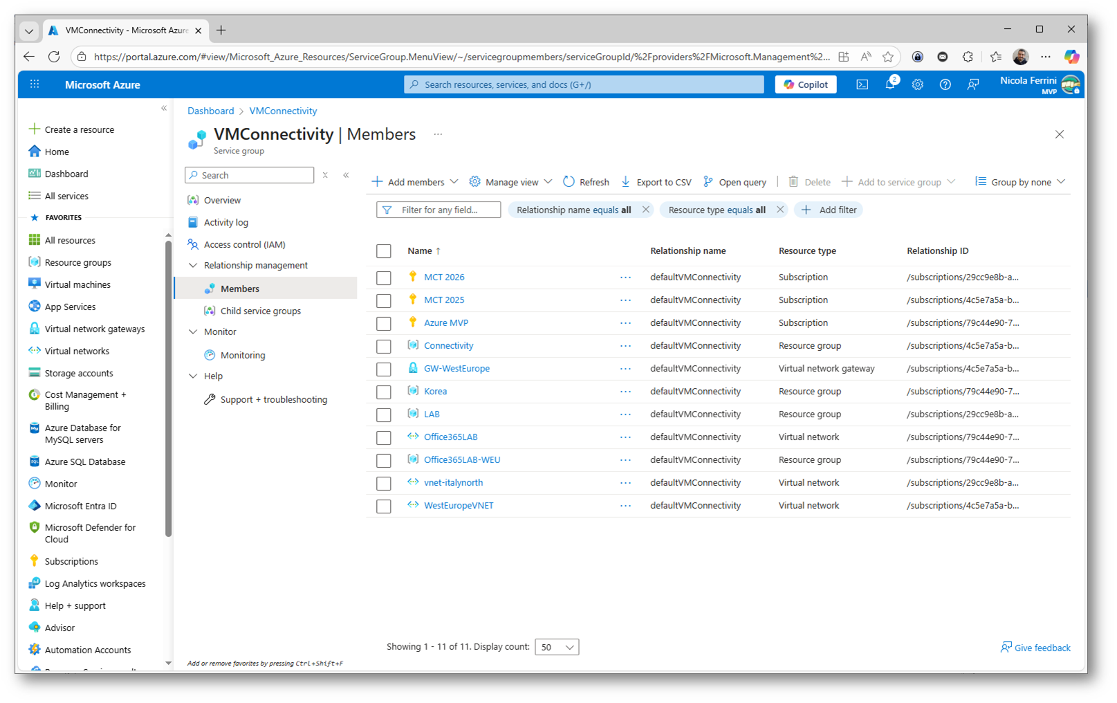 Nella vista Members potete visualizzare in dettaglio tutti i membri associati al Service Group, inclusi sottoscrizioni, Resource Group e singole risorse, insieme al tipo di relazione e all’identificativo della relazione. Questa vista consente anche di filtrare, esportare e gestire le relazioni esistenti, facilitando il controllo e la manutenzione del servizio nel tempo.
