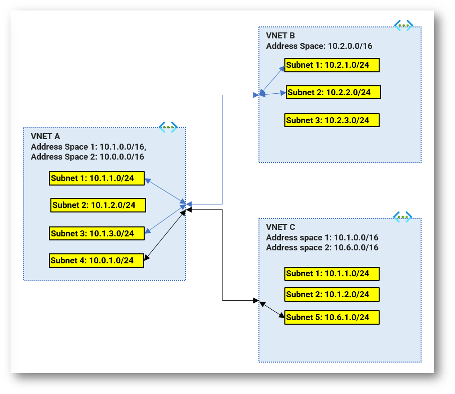 Nel disegno è inoltre evidente un altro vantaggio: VNET-C, pur avendo address space parzialmente sovrapposti a VNET-A, non entra in conflitto con questo scenario perché il subnet peering opera a livello di subnet specifiche e non di VNet complete. Questo vi permette di mantenere ambienti separati e controllati anche in presenza di indirizzamenti complessi o legacy.