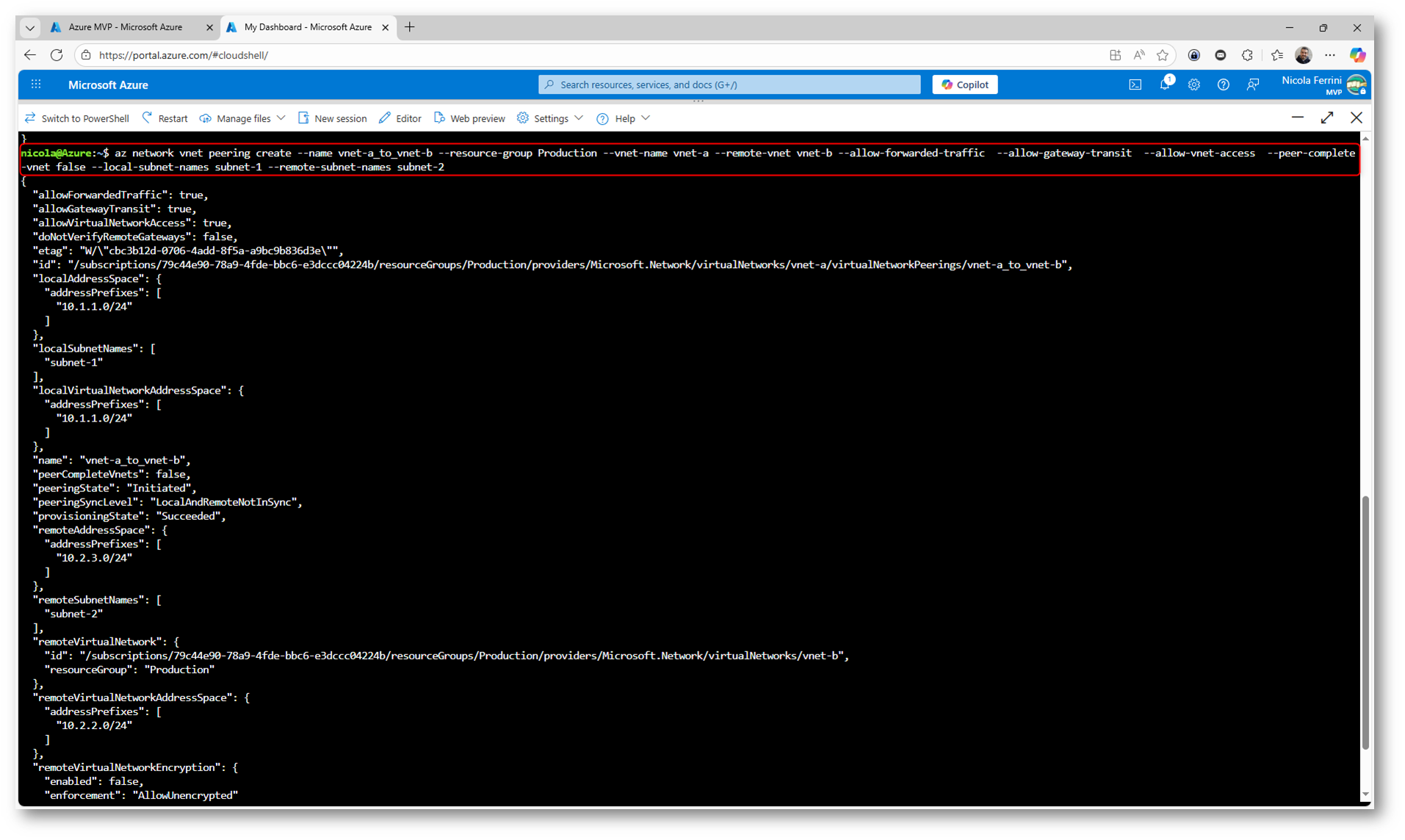 Per la creazione dei subnet peering utilizzeremo Azure Cloud Shell e Azure CLI. Come per il peering tradizionale tra Virtual Network, anche il subnet peering richiede la configurazione di entrambe le relazioni di peering, una per ciascun lato, in modo da rendere effettiva la connettività bidirezionale tra le subnet coinvolte.