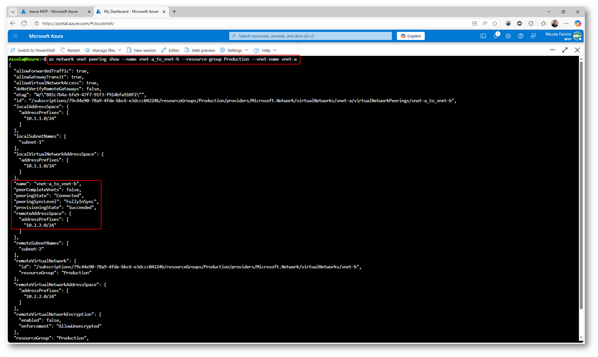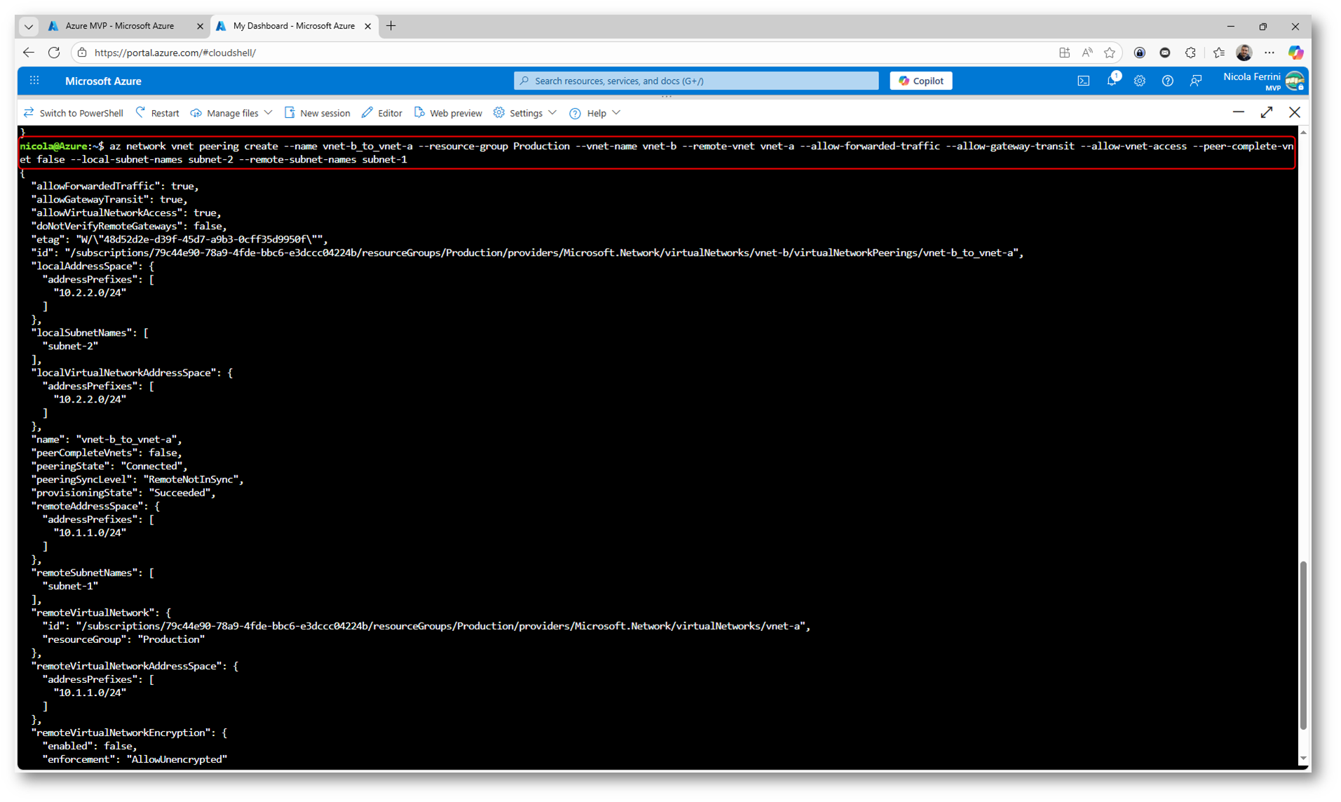 Per completare la configurazione ed abilitare la connettività bidirezionale, è necessario creare anche il subnet peering da VNET-B verso VNET-A. Questo secondo comando è indispensabile perché il peering, anche in modalità subnet, è unidirezionale e deve essere definito su entrambi i lati.