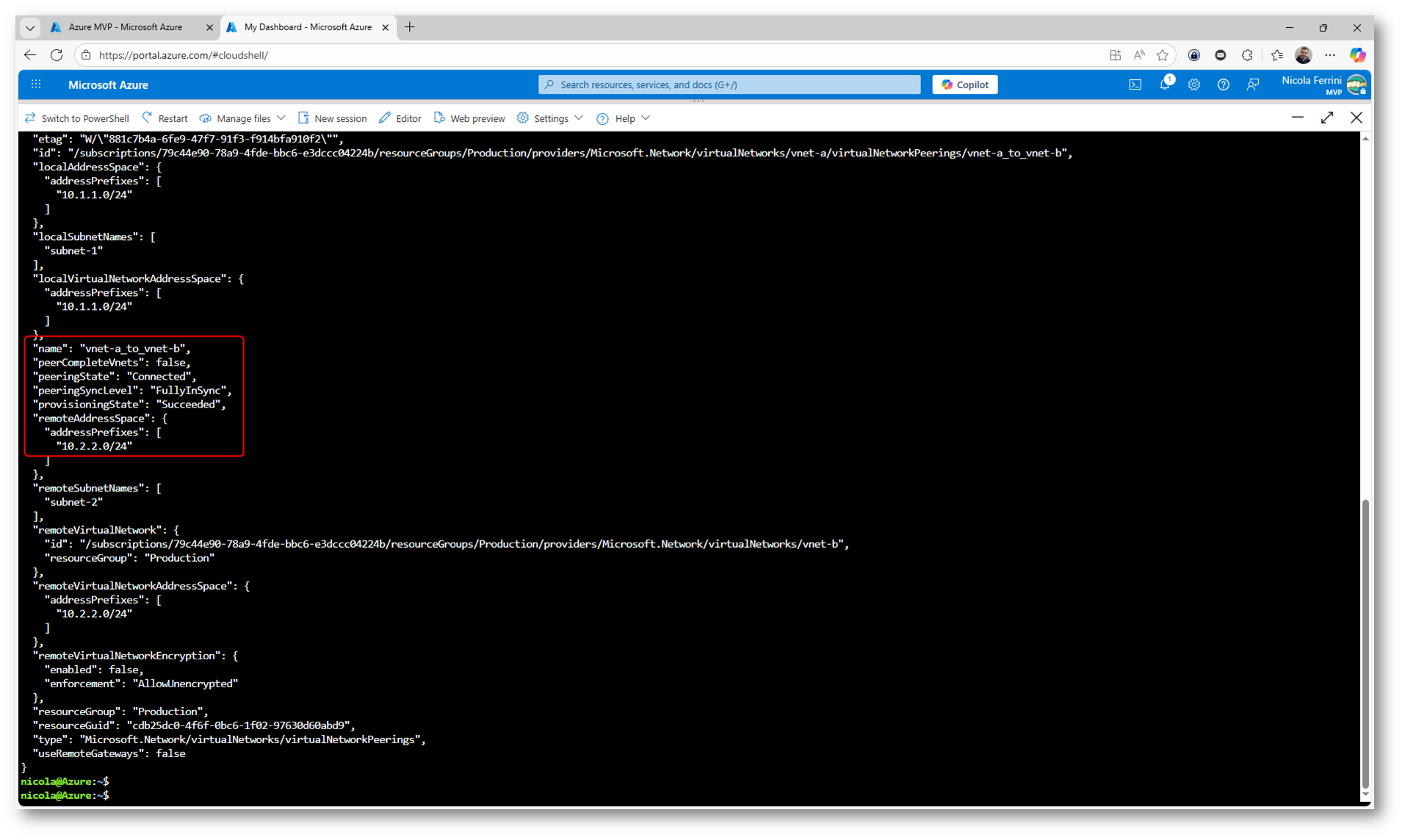 Dopo aver completato la registrazione della feature richiesta sulla subscription, potete rilanciare il comando di creazione del subnet peering. In questo caso l’operazione viene eseguita correttamente e Azure restituisce l’output JSON relativo al nuovo peering appena creato.