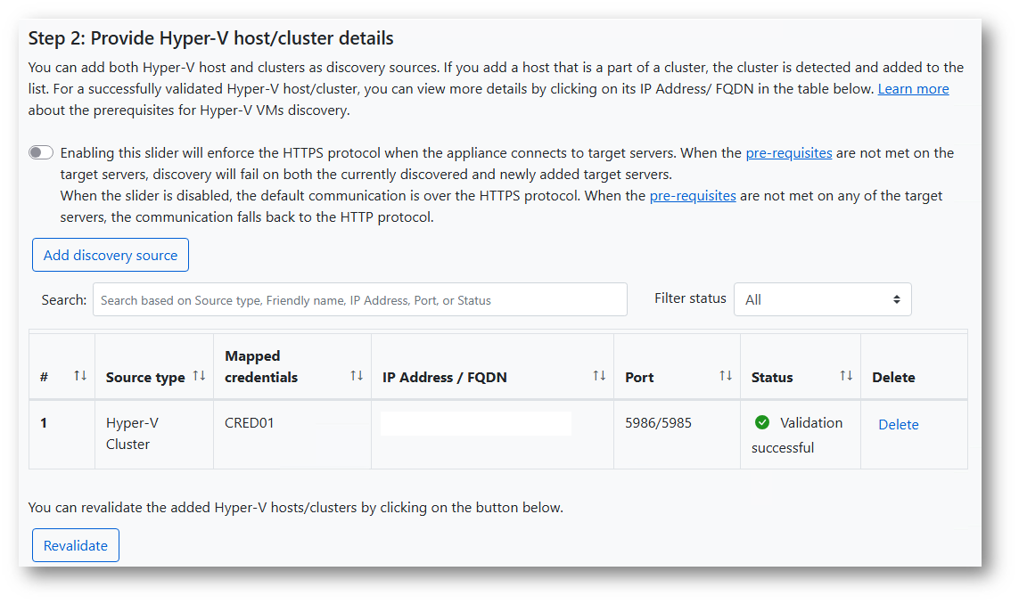 Successivamente, seguendo l’ordine di inserimento proposto dall’appliance, abbiamo aggiunto il nome tramite FQDN del cluster Hyper-v e associato il set di credenziali specificato sopra.