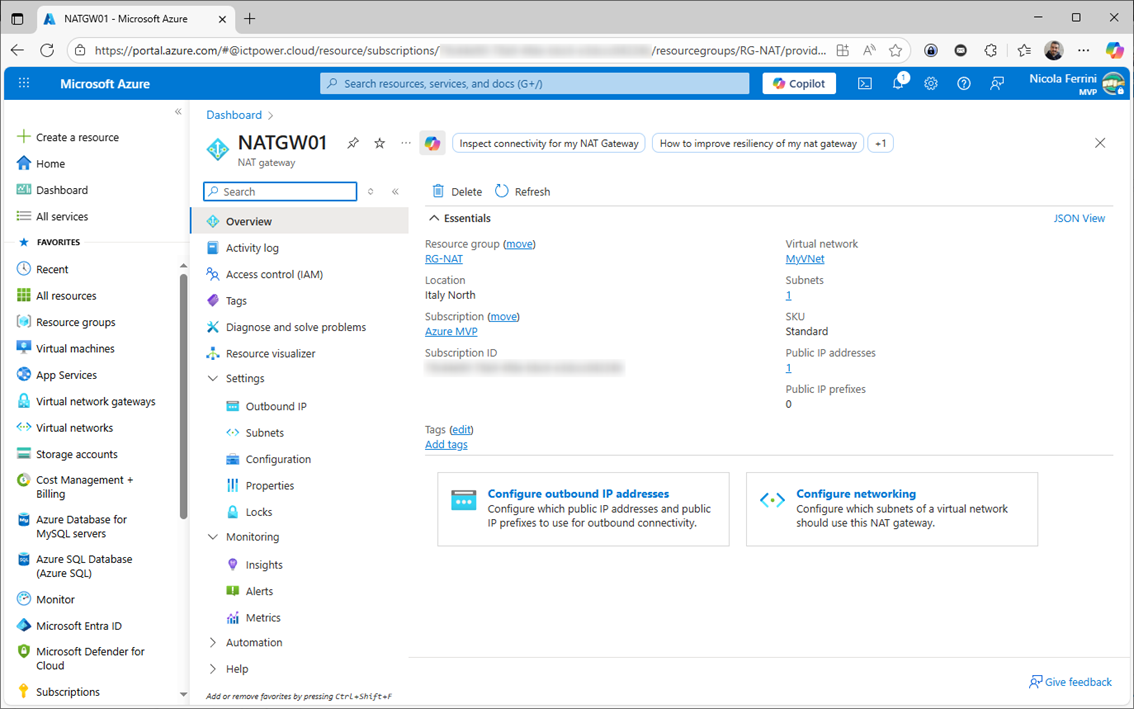 Trovate una descrizione completa, con immagini e passaggi dettagliati, nell’articolo Azure NAT Gateway – Gestione del traffico in uscita dalle VM eseguite in Azure – ICT Power