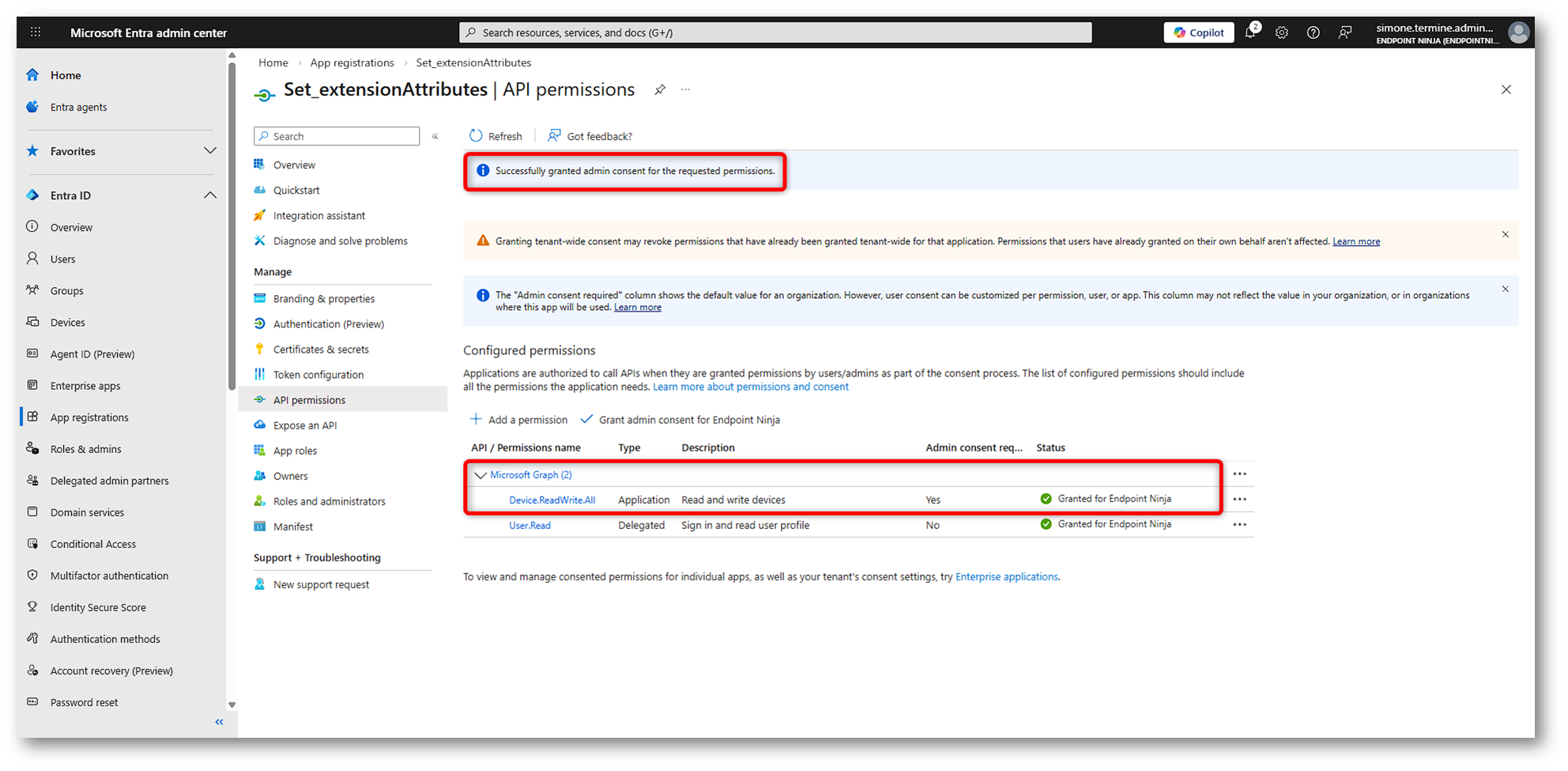 Al termine dell’operazione, verrà mostrato un messaggio di conferma e lo stato della permission risulterà Granted (l’avviso scomparirà), indicando che l’app è ora autorizzata a utilizzare Device.ReadWrite.All per chiamare Microsoft Graph nel tenant