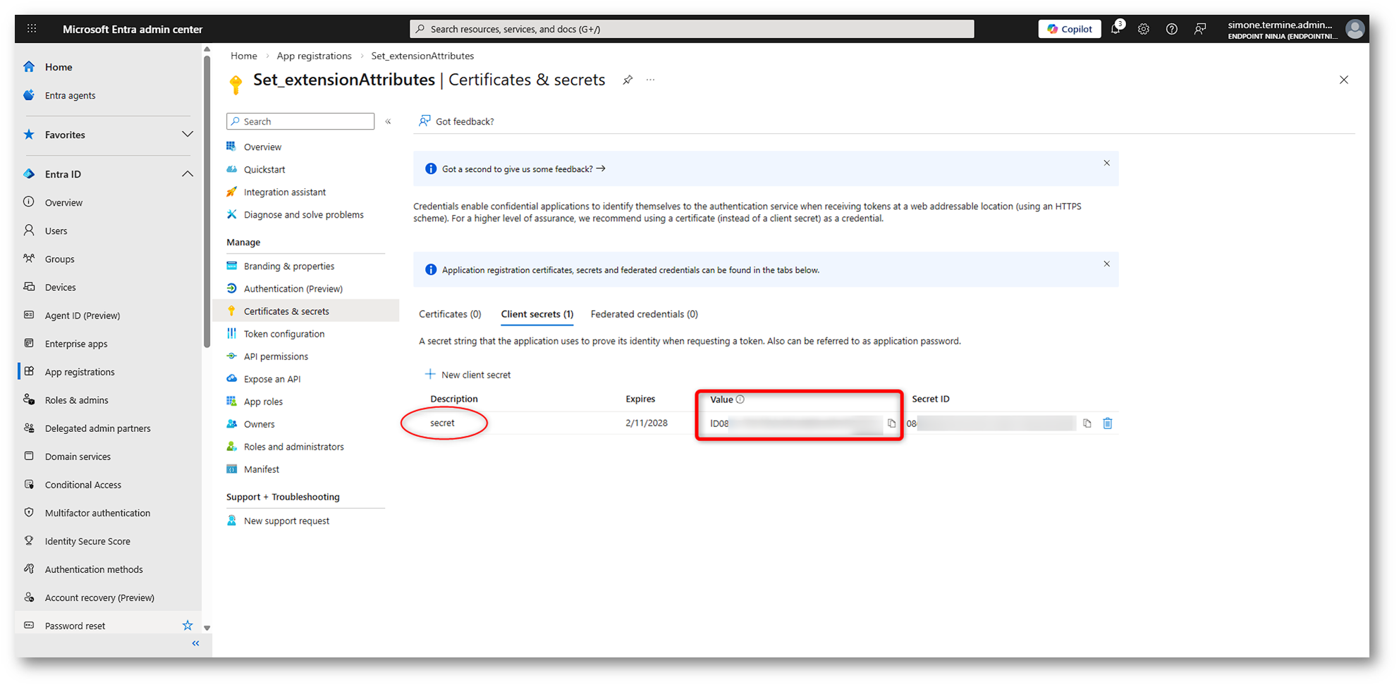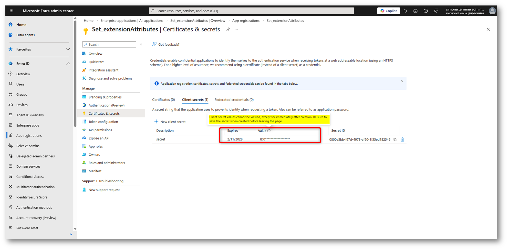 È importante ricordare che il valore del secret viene mostrato una sola volta. Se non viene salvato subito, non sarà più recuperabile e sarà necessario generarne uno nuovo; va quindi copiato e conservato in modo sicuro. In scenari reali è preferibile utilizzare un certificato o un meccanismo che eviti credenziali statiche sugli endpoint, ma per un POC il client secret è sufficiente.