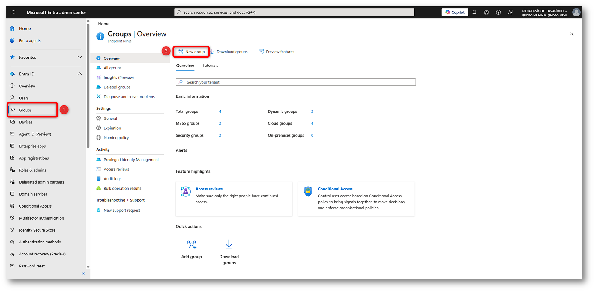 Adesso possiamo creare il gruppo dinamico. Spostiamoci nella sezione Groups del Microsoft Entra admin center e selezioniamo New group