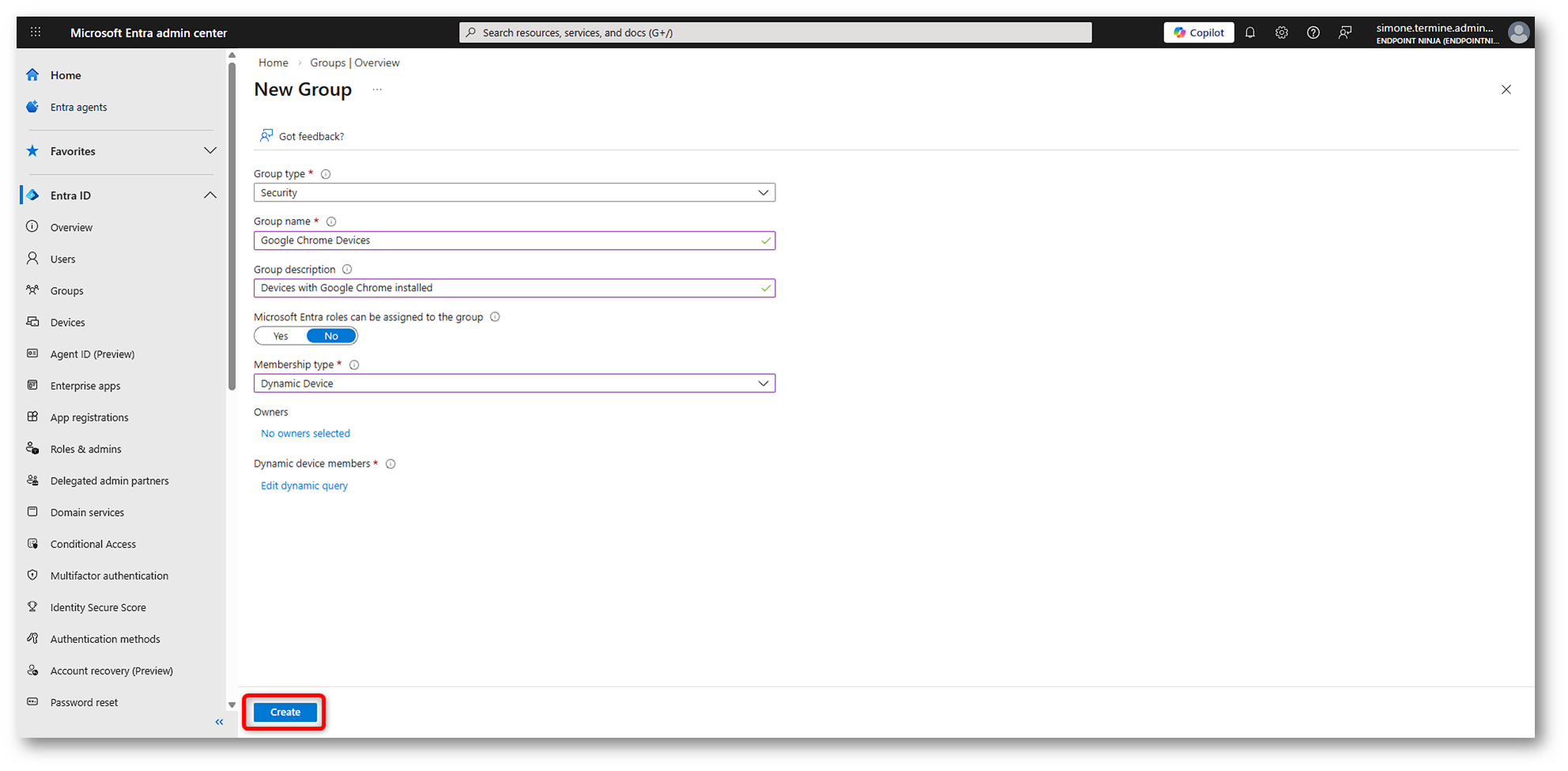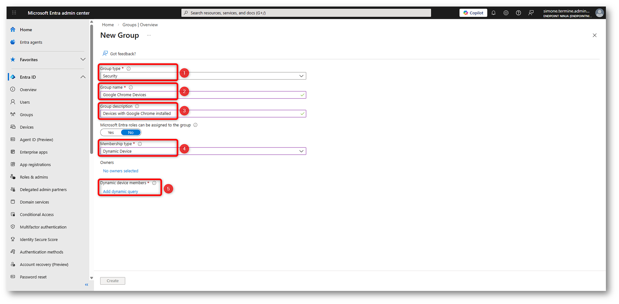 Nella pagina che si apre impostiamo Group type su Security, assegniamo un valore a Group name (ad esempio Google Chrome Devices) e, se necessario, aggiungiamo una descrizione. In Membership type selezioniamo Dynamic device, quindi facciamo clic su Add dynamic query per definire la regola di membership.