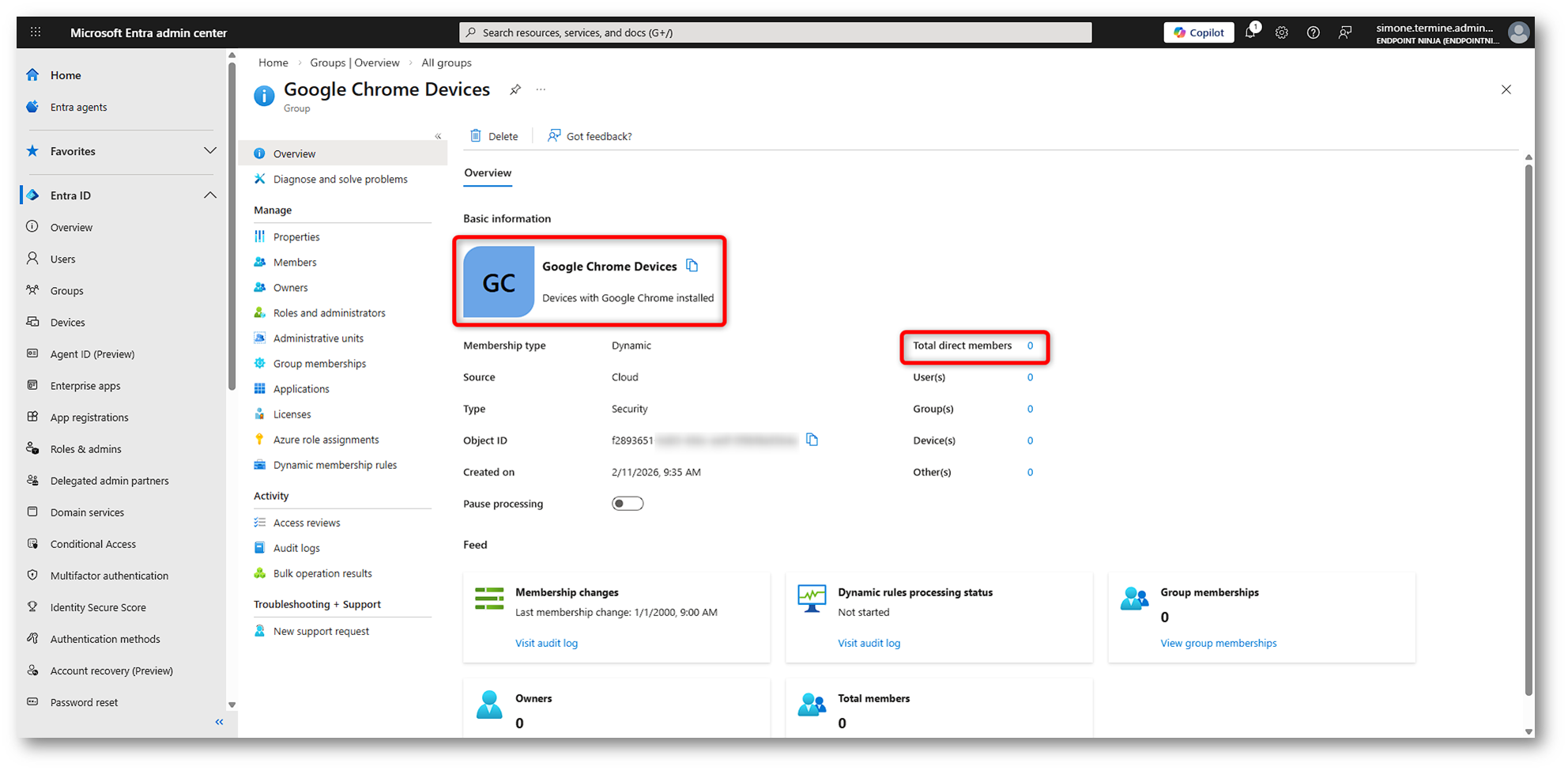 Come possiamo notare nella pagina Overview del gruppo appena creato, al momento non sono presenti membri. È un comportamento atteso, poiché in questa fase nessun dispositivo risulta ancora valorizzato con HasChrome in extensionAttribute1; quindi, la regola di membership non può includere alcun device. Nel prossimo capitolo vedremo come scrivere la logica in PowerShell per calcolare il parametro sul client e pubblicarlo in Entra ID tramite Microsoft Graph.
