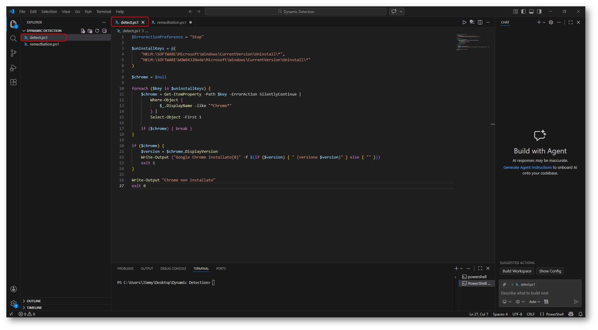 Nel file detect.ps1 implementeremo una logica volutamente semplice. L’obiettivo è verificare se Google Chrome risulta installato sul dispositivo. Se la verifica ha esito positivo, lo script terminerà con exit 1 così da segnalare a Intune che è necessaria la remediation e attivare l’esecuzione di remediation.ps1. In caso contrario, terminerà con exit 0 e non verrà avviata alcuna azione correttiva.