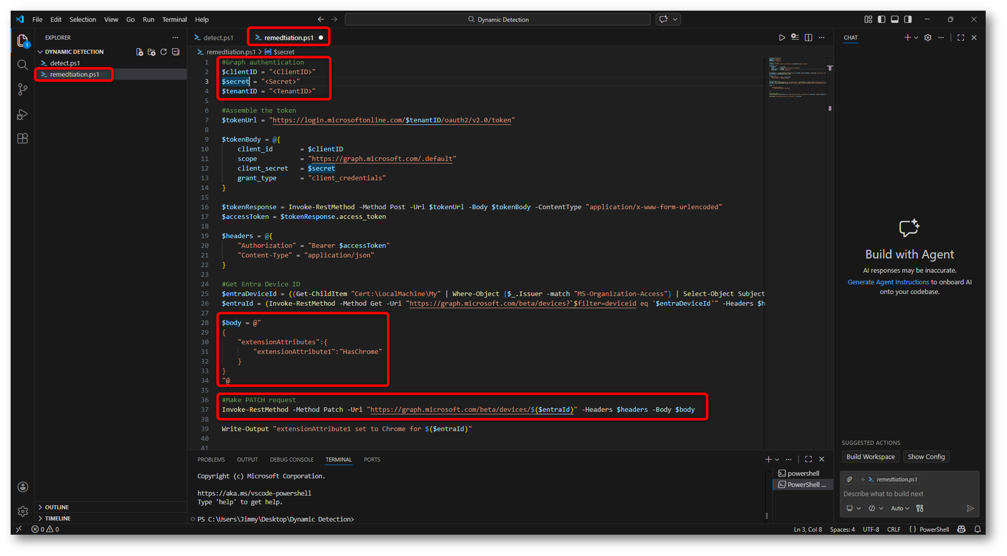 A questo punto dobbiamo individuare il dispositivo in Entra ID. Lo script ricava il Device ID locale (GUID) e lo usa per interrogare Microsoft Graph e ottenere l’id dell’oggetto device in directory. Questo passaggio è necessario perché l’operazione di aggiornamento tramite PATCH viene eseguita sull’oggetto device in Entra. Una volta ottenuto l’identificativo, costruiamo il body JSON impostando extensionAttributes.extensionAttribute1 al valore atteso dalla regola del gruppo dinamico (nel nostro esempio HasChrome) e inviamo la richiesta PATCH a Microsoft Graph. Al termine della chiamata, l’attributo risulta valorizzato sull’oggetto device e la regola di membership del gruppo dinamico potrà includere il dispositivo in base alla condizione configurata.