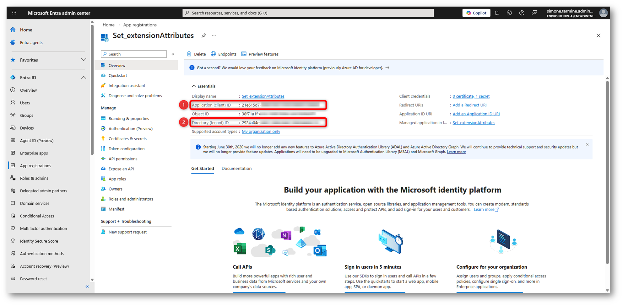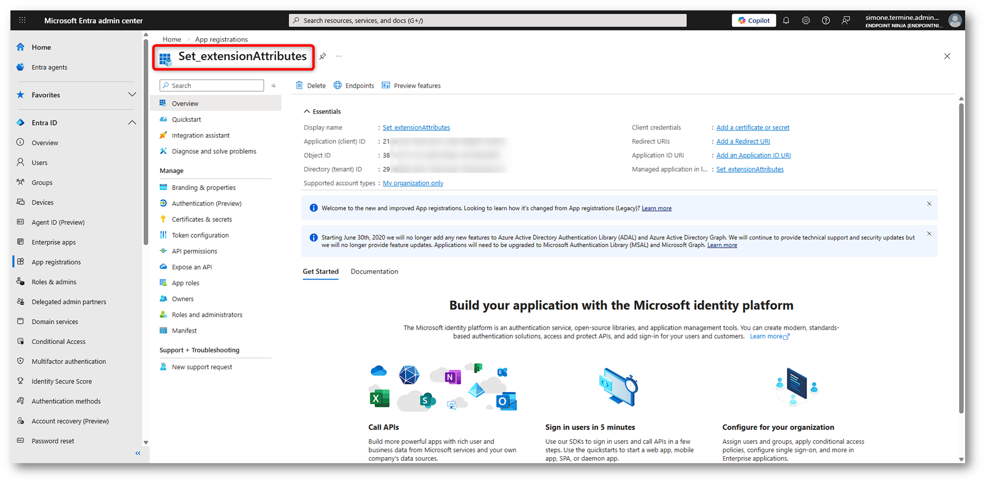 Dopo qualche secondo, l’Entra admin center farà redirect sulla pagina della nostra nuova app registration appena creata