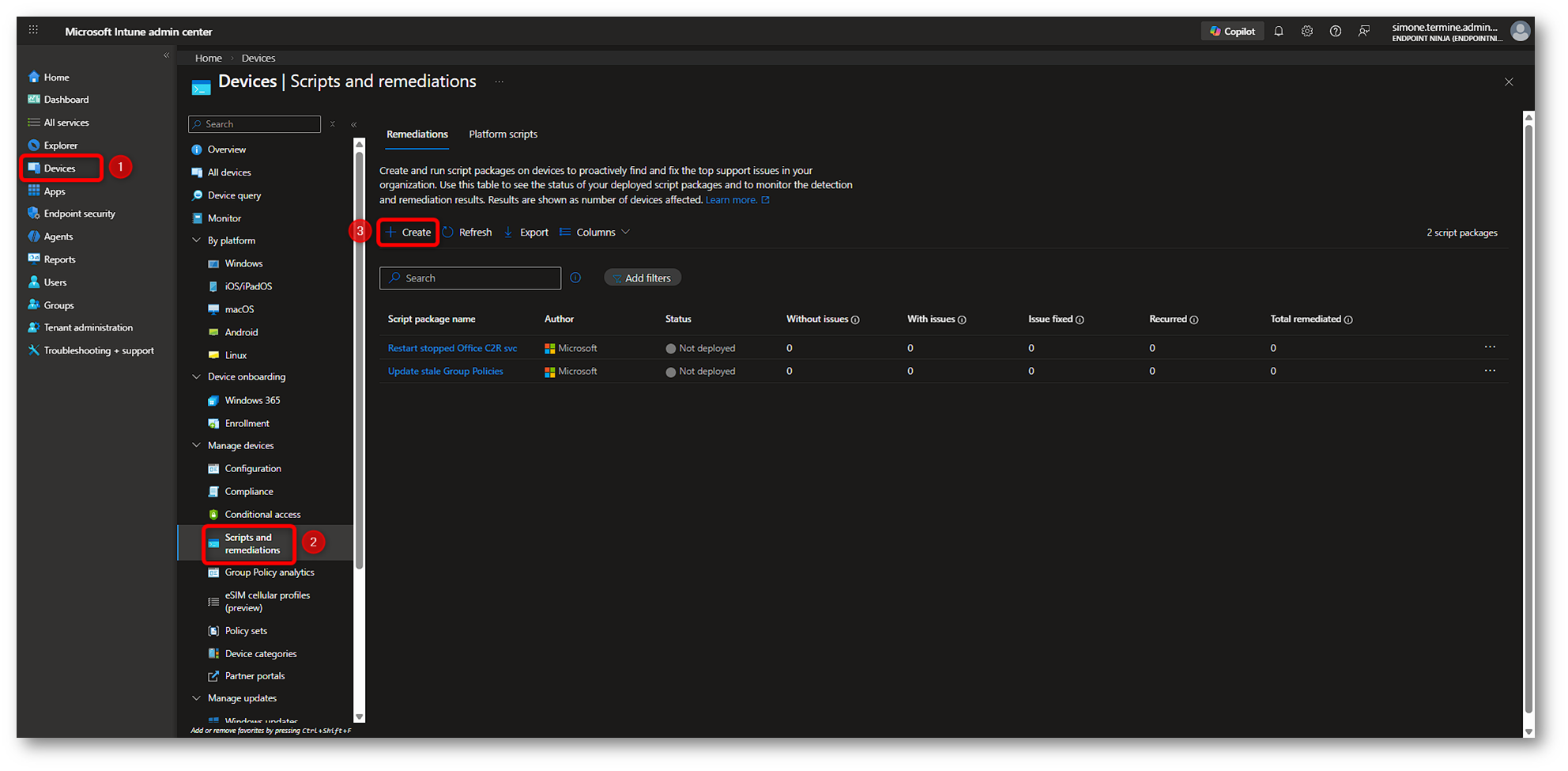 Siamo ormai quasi arrivati al termine di questa guida, passiamo ora al Microsoft Intune admin center per creare e distribuire la remediation che eseguirà i nostri script sui dispositivi. In questa fase caricheremo il detection script e il remediation script, configureremo la pianificazione di esecuzione e assegneremo il pacchetto a un gruppo di test, così da iniziare a valorizzare extensionAttribute1 in Microsoft Entra ID e, di conseguenza, popolare automaticamente il gruppo dinamico creato nei capitoli precedenti.
