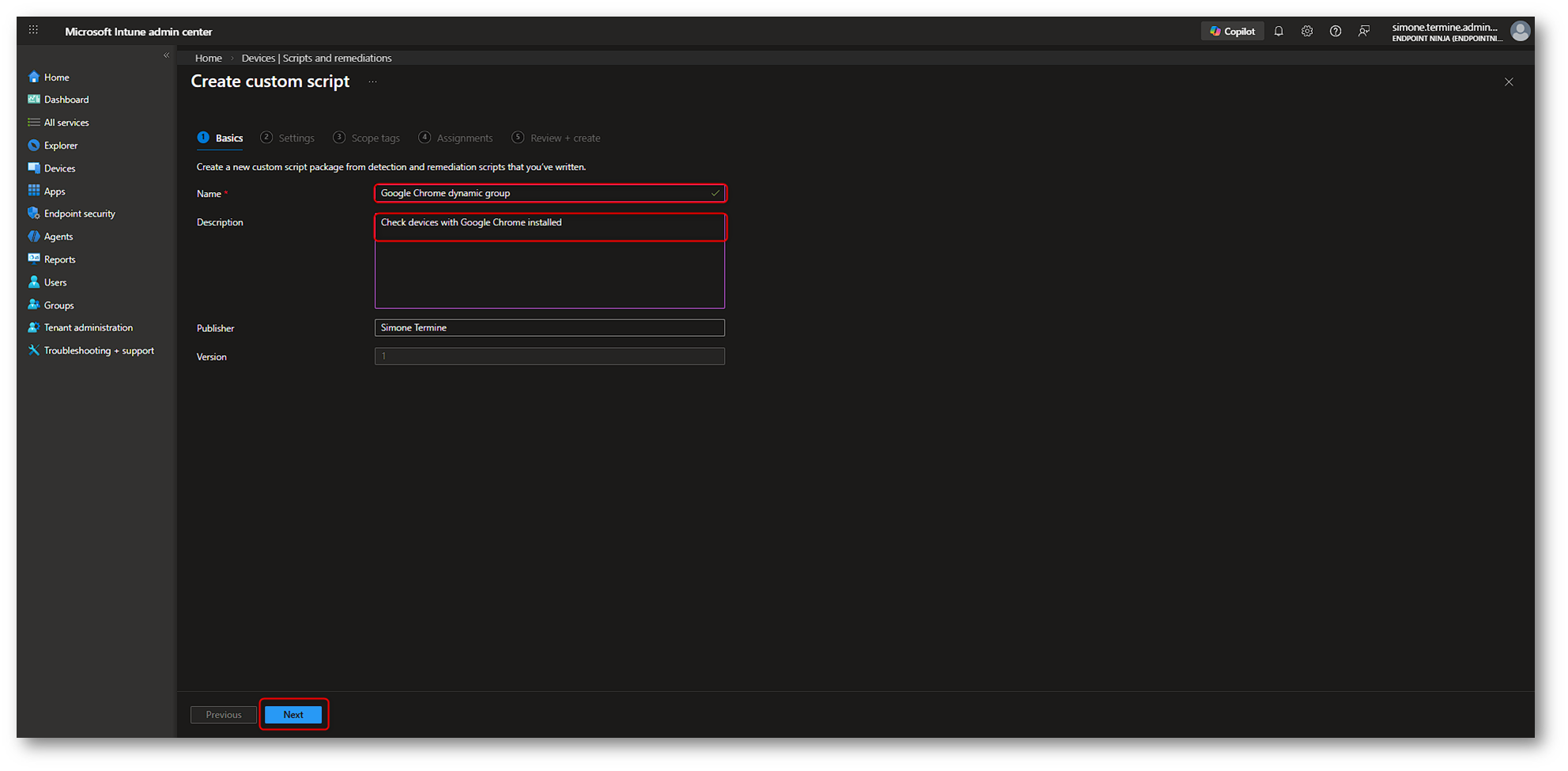 Si aprirà il wizard Create custom script. Nella sezione Basics inseriamo il nome della nostra Intune Remediation, una descrizione e facciamo click su Next.