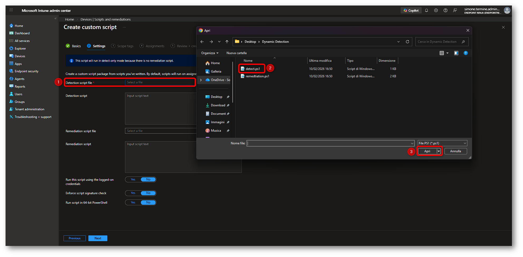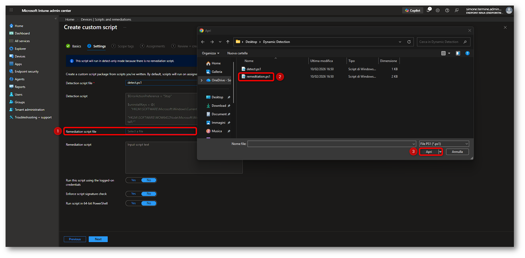 Nella sezione Settings carichiamo i due script creati nel capitolo “PowerShell e logica“. Per Detection script file e Remediation script file facciamo clic su Select a file e selezioniamo i file corrispondenti.