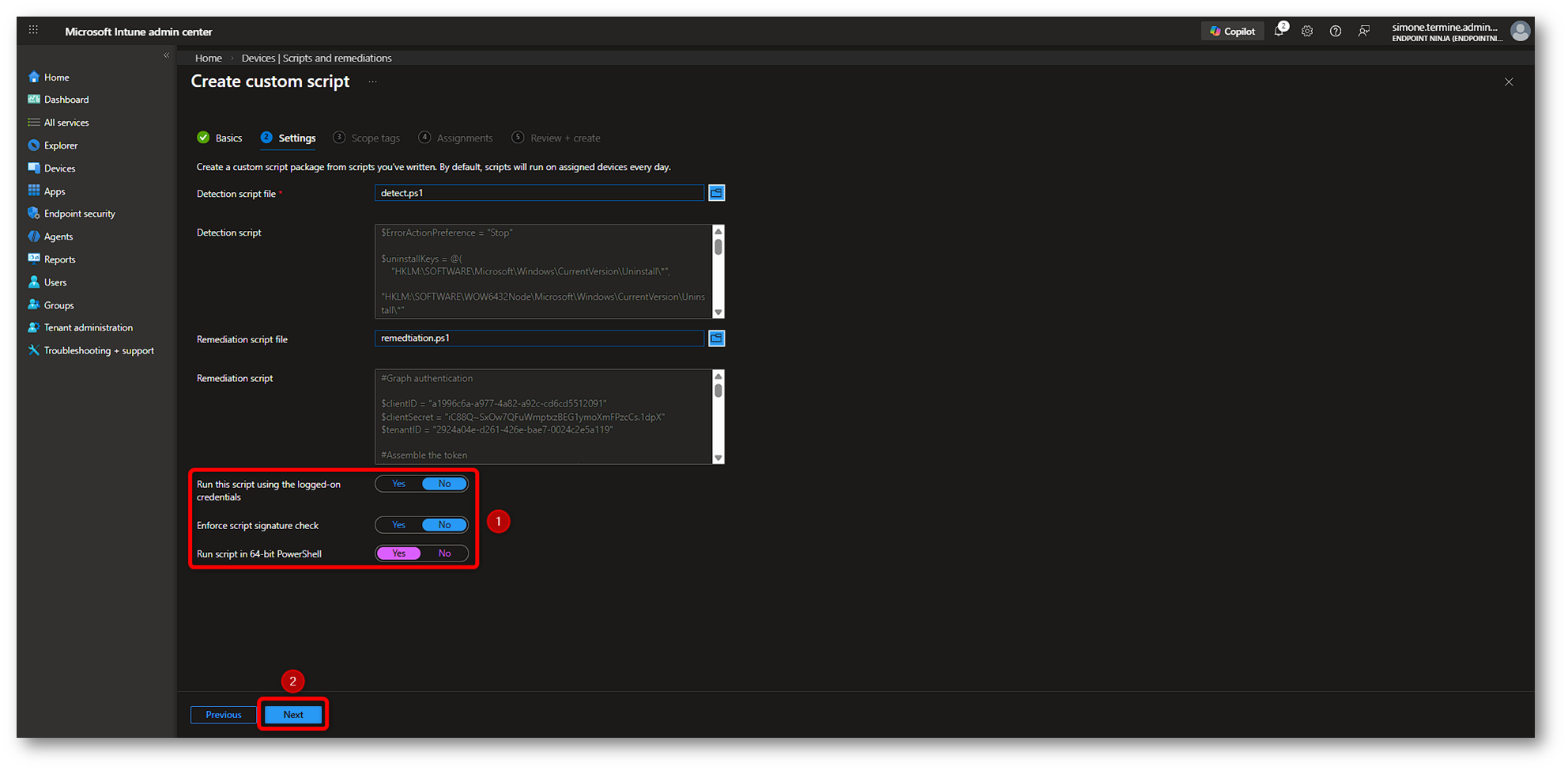 Per questa demo lasciamo Run this script using the logged-on credentials su No ed Enforce script signature check su No, quindi impostiamo Run script in 64-bit PowerShell su Yes. A questo punto proseguiamo con Next.
