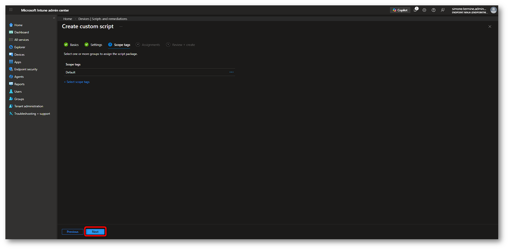Nella sezione Scope tags (opzionale) lasciare Default, oppure selezionare uno scope tags già creato in precedenza nel vostro ambiente Intune. Nel nostro caso lasceremo quello di default. Successivamente cliccate su Next.