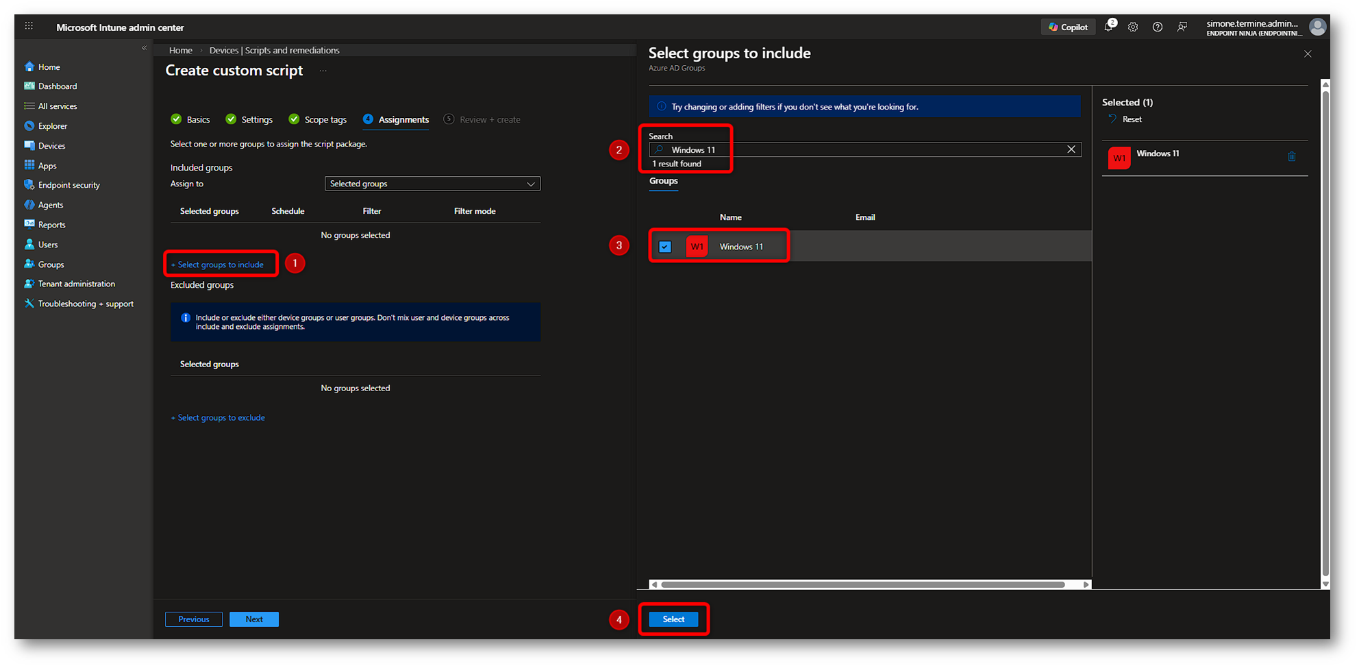 Nella sezione Assignments assegnamo la remediation al target desiderato. Facciamo clic su Select groups to include, cerchiamo il gruppo su cui vogliamo eseguire la remediation, selezioniamolo tramite la checkbox e confermiamo con Select.