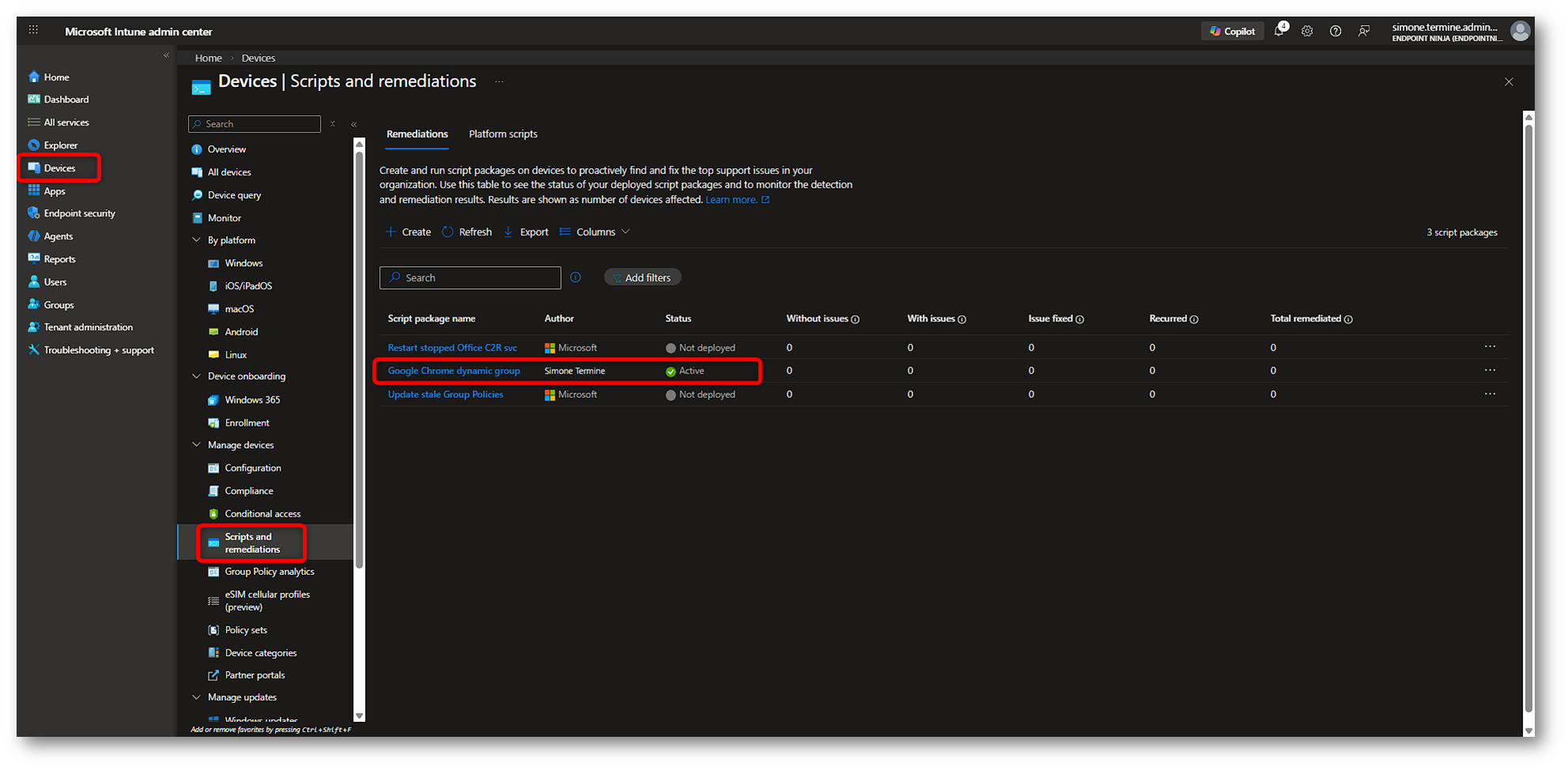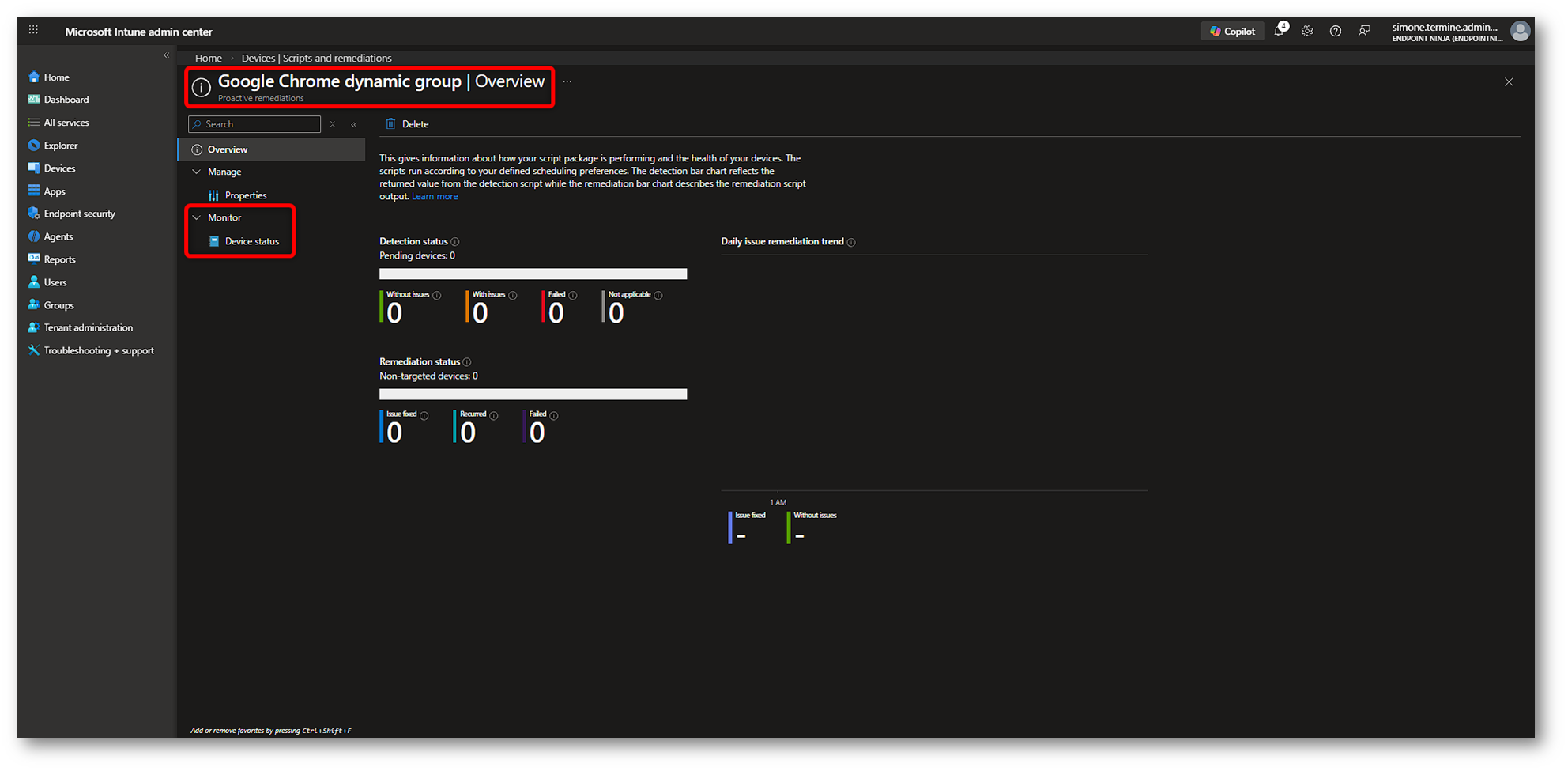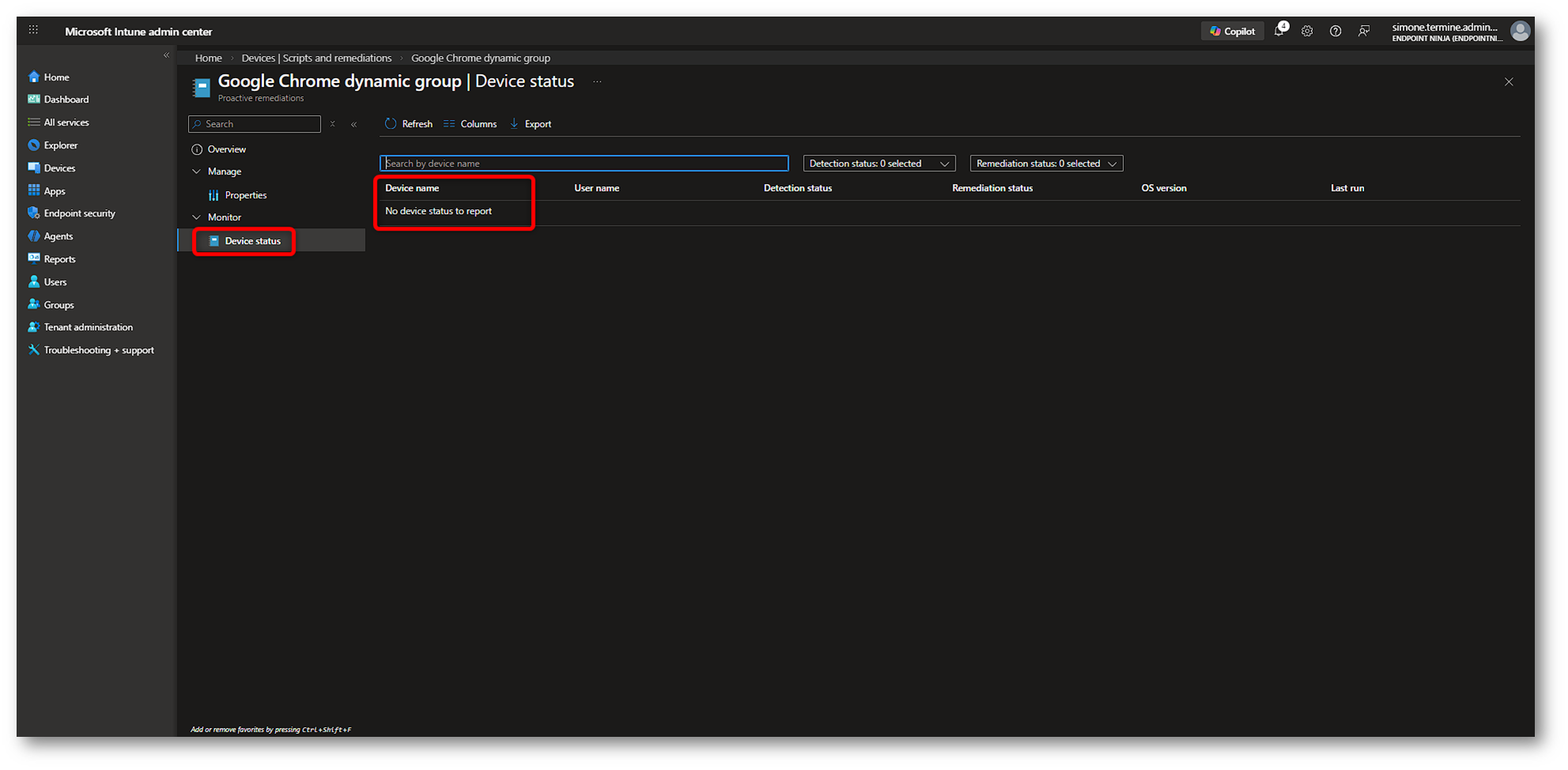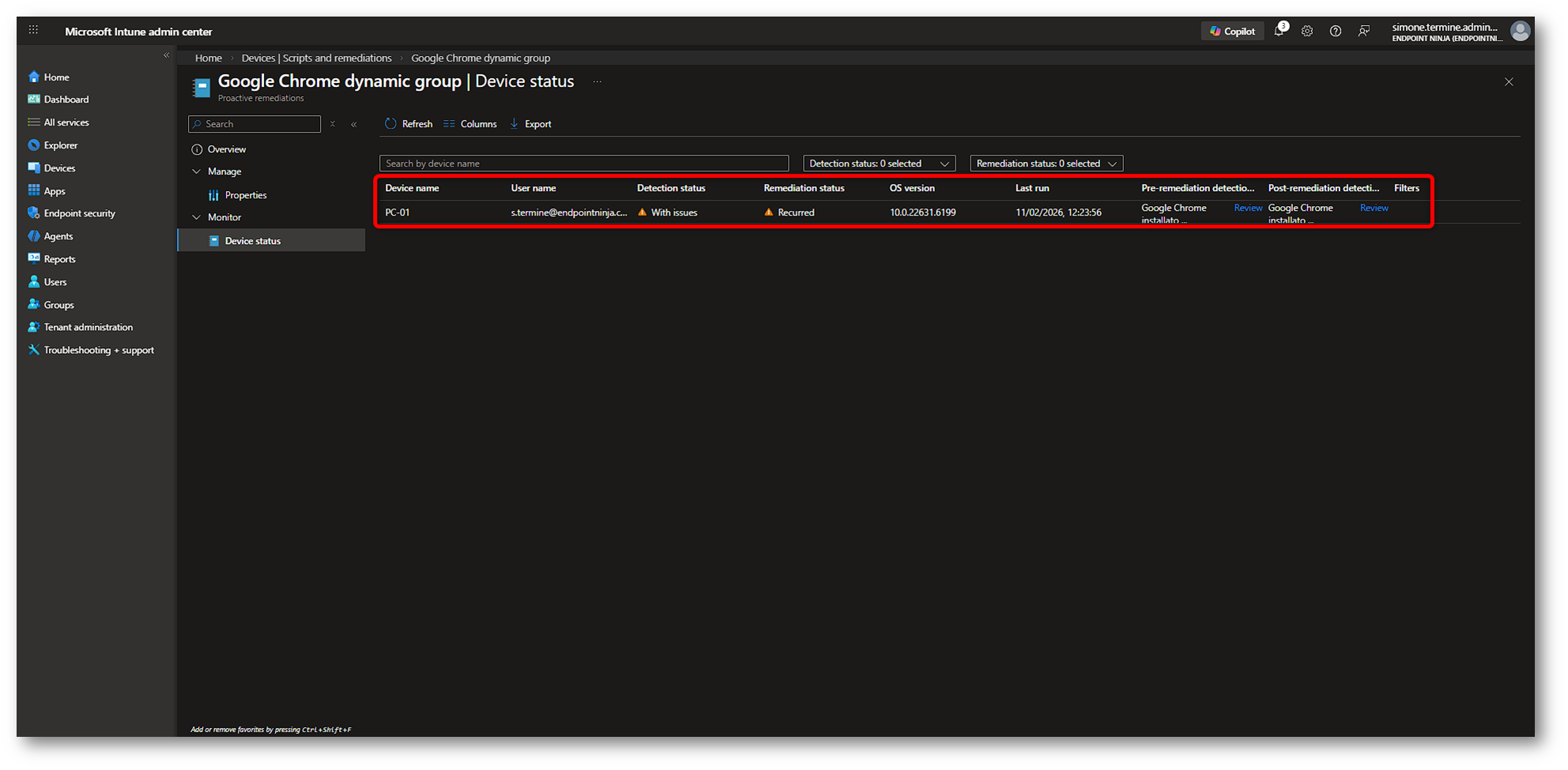 Una volta distribuita la Intune Remediation, verifichiamo che i dispositivi abbiano recepito la configurazione e che il gruppo dinamico Google Chrome Devices inizi a popolarsi correttamente. Dal Microsoft Intune admin center apriamo Scripts and remediations, selezioniamo la remediation Google Chrome dynamic group e accediamo alla sezione Monitor > Device status.