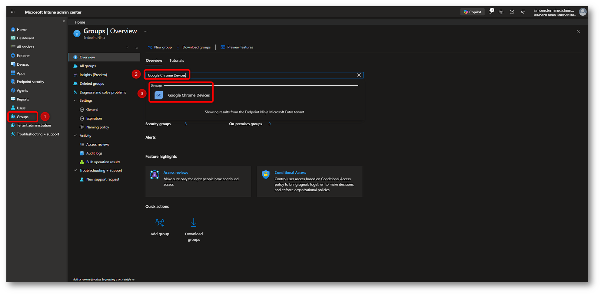 A questo punto verifichiamo che il gruppo dinamico sia stato popolato correttamente con il dispositivo PC-01, sul quale è stata eseguita la remediation. Dal Microsoft Intune admin center (oppure direttamente dal Microsoft Entra admin center), spostiamoci nella sezione Groups, utilizziamo la barra di ricerca per individuare il gruppo creato in precedenza (Google Chrome Devices) e selezioniamolo.