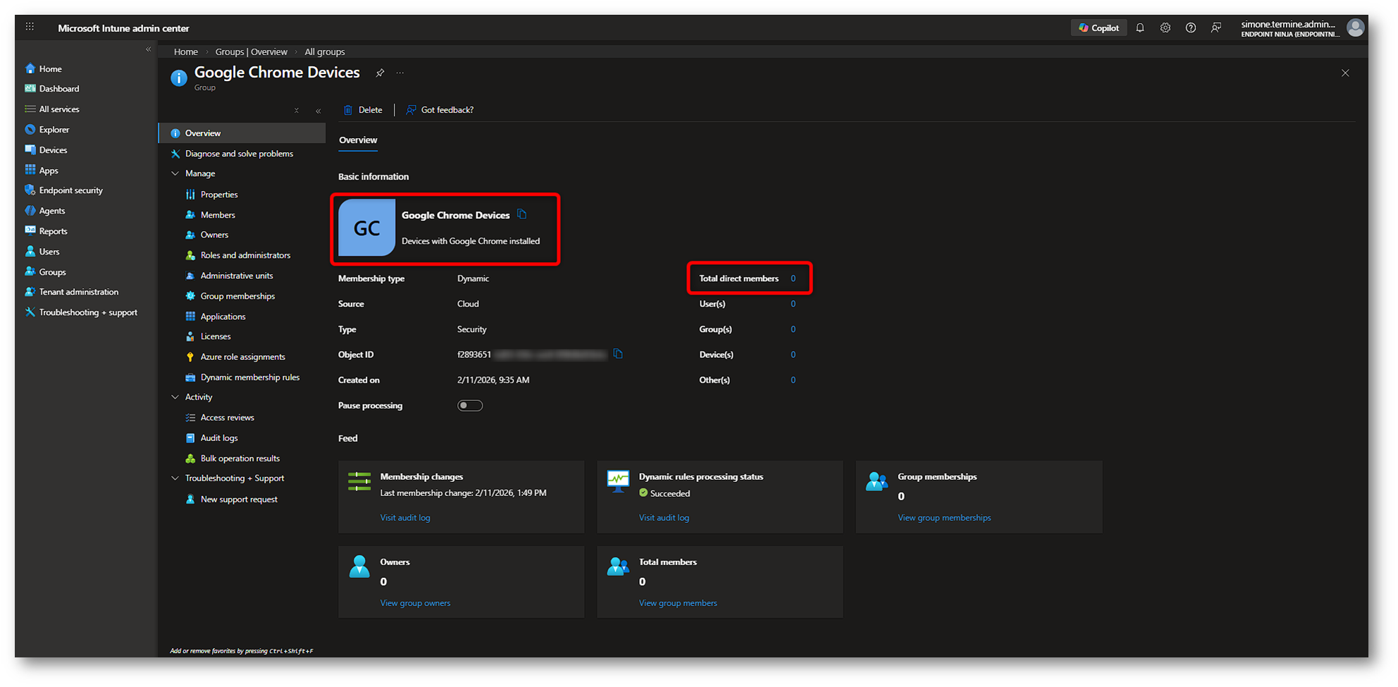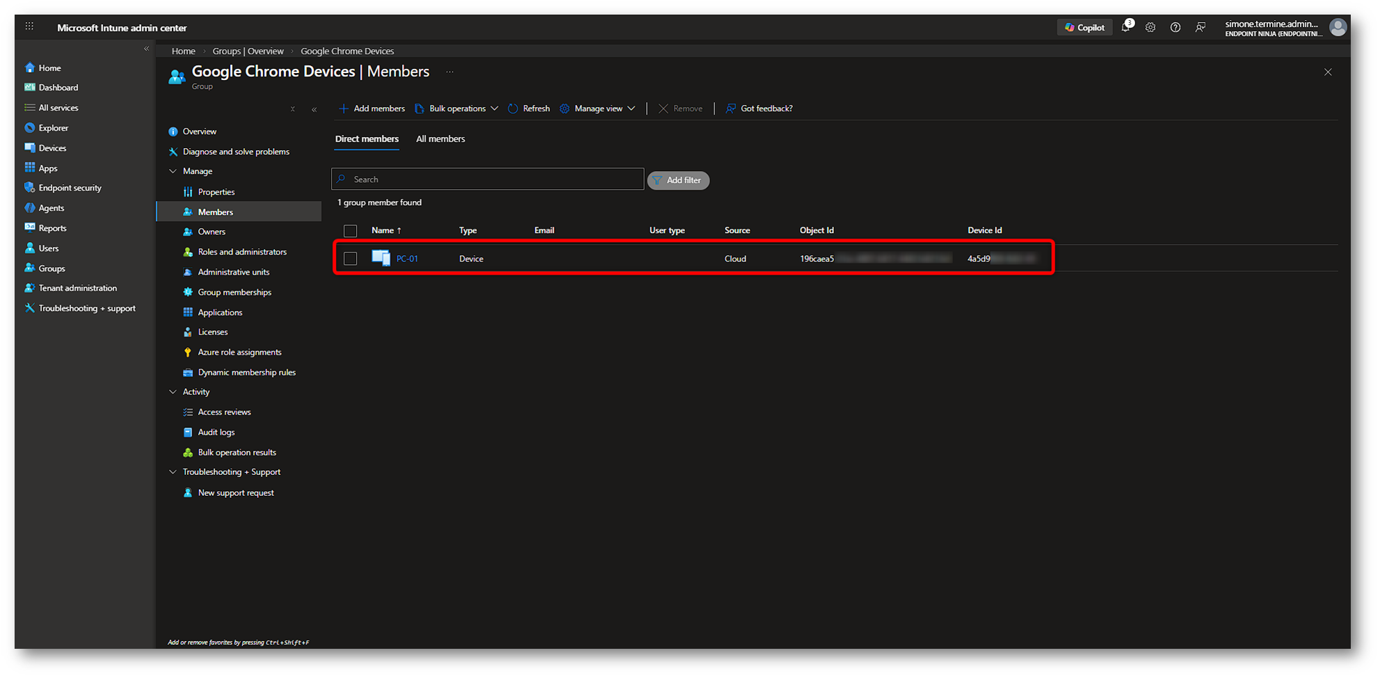 Quando l’esecuzione sarà avvenuta sui dispositivi inclusi nell’assegnazione, in Device status vedremo i record con l’esito del detection/remediation. A valle dell’aggiornamento di extensionAttribute1 in Entra ID, anche la membership del gruppo dinamico verrà rivalutata e il gruppo Google Chrome Devices inizierà a includere i dispositivi in linea con la regola configurata.
