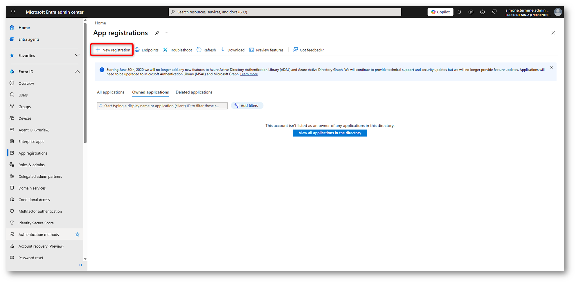 Per creare la nostra applicazione, come prima cosa, colleghiamoci al Microsoft Entra admin center e navighiamo in Entra ID > App registrations