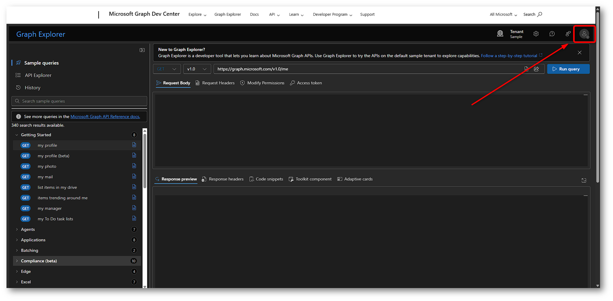 Colleghiamoci al portale di Graph Explorer e autentichiamoci selezionando l’icona del profilo in alto a destra.