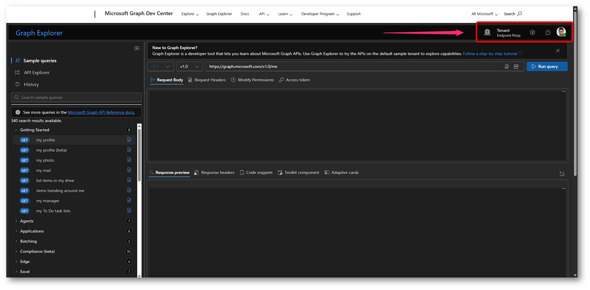 Una volta autenticati, verifichiamo di operare nel tenant corretto: Graph Explorer mostra chiaramente l’organizzazione in uso, così da evitare richieste eseguite sul tenant sbagliato.