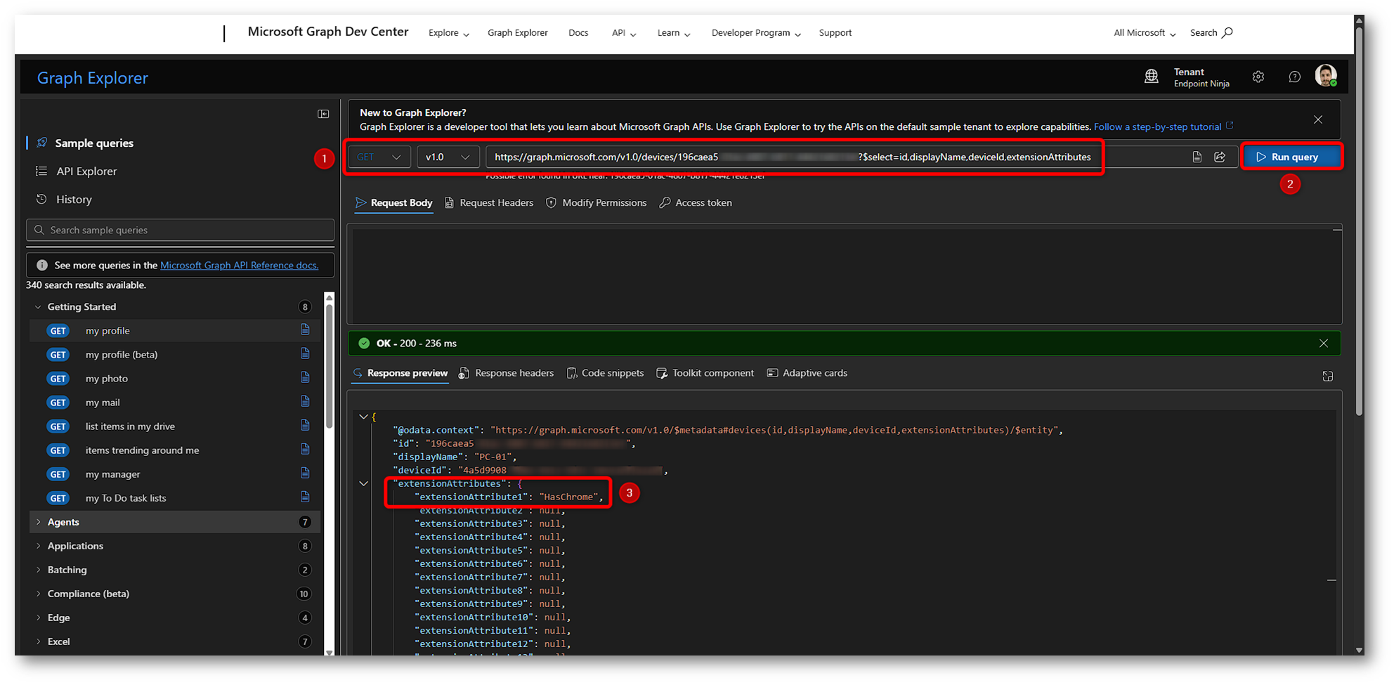 Per completare la validazione end-to-end, è utile verificare direttamente su Microsoft Graph che l’attributo sia stato scritto sull’oggetto dispositivo in Microsoft Entra ID. Graph Explorer ci consente di interrogare l’oggetto device e visualizzare i valori di extensionAttributes senza affidarci esclusivamente alla UI del portale, risultando particolarmente utile sia per confermare la corretta esecuzione della remediation sia per attività di troubleshooting e rollback.