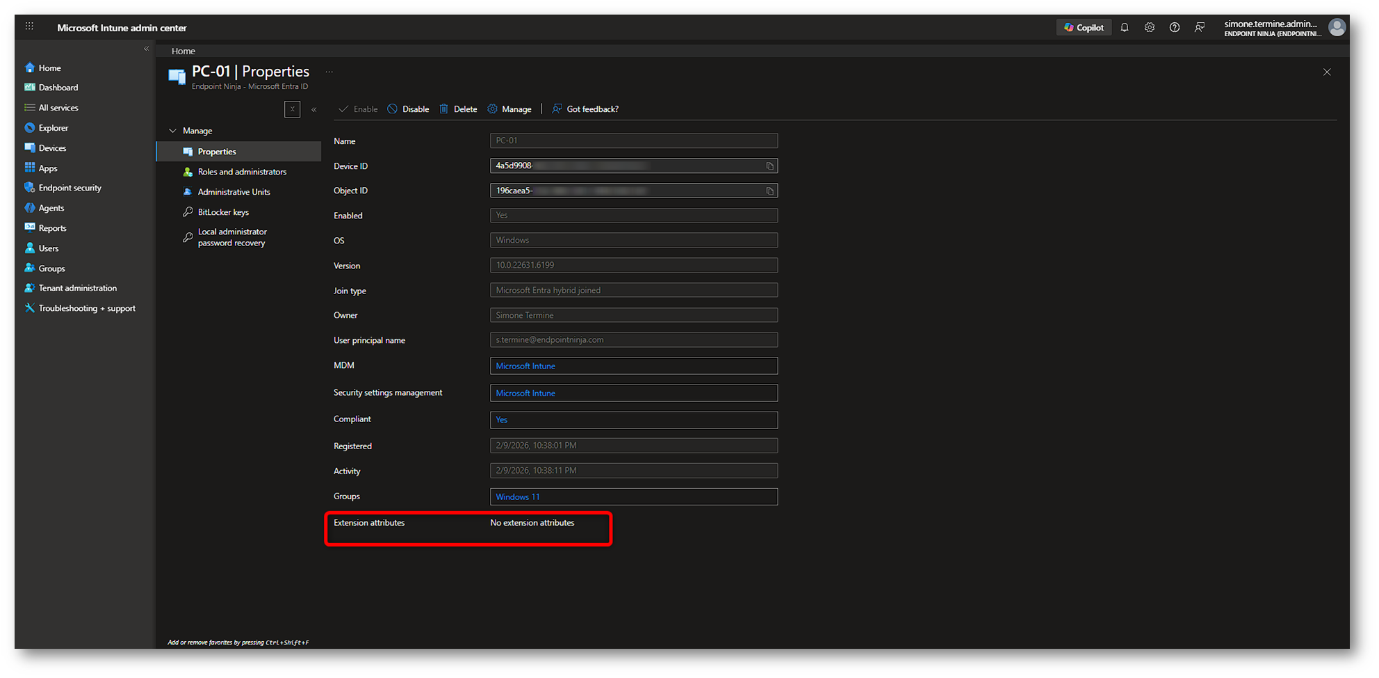Dopo aver eseguito la richiesta, tornando nelle proprietà del dispositivo in Microsoft Entra (o nell’Intune admin center), noteremo che nella sezione Extension attributes il valore di extensionAttribute1 non sarà più presente, poiché risulterà vuoto e non più valorizzato.