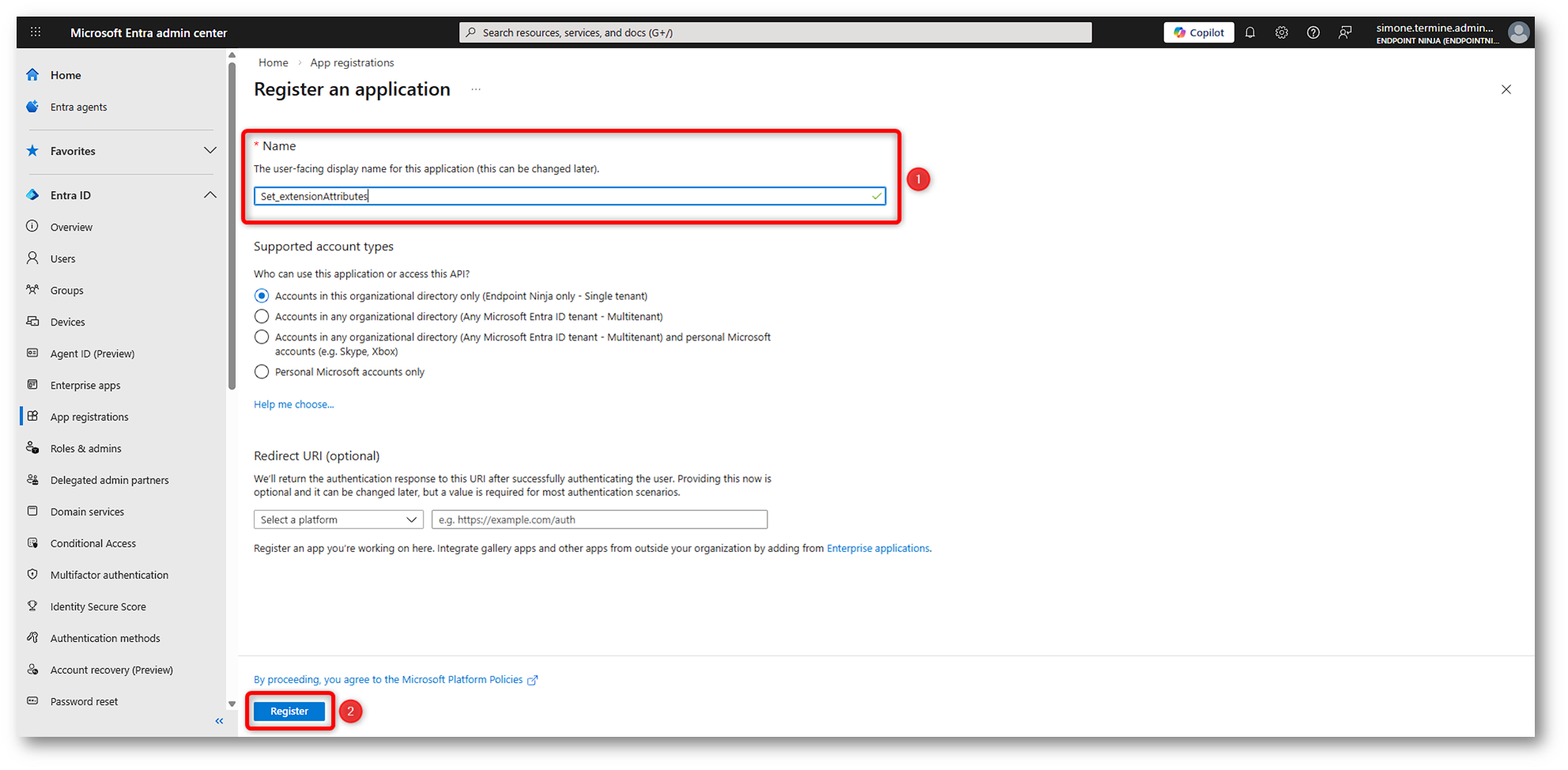 Un App Registration serve per stabilire una relazione di trust tra un’applicazione e Microsoft Entra ID, in modo che l’app possa autenticarsi e ottenere token OAuth2 per chiamare API protette come Microsoft Graph. In questo scenario ci serve perché lo script di remediation deve poter invocare Graph ed eseguire l’aggiornamento dell’oggetto dispositivo in Entra ID (valorizzando extensionAttributes). In pratica, l’App Registration definisce l’identità dell’app (Client ID), il tenant di riferimento (Tenant ID) e il metodo con cui l’app dimostra la propria identità (client secret o certificato), oltre ai permessi necessari per operare sugli oggetti della directory.