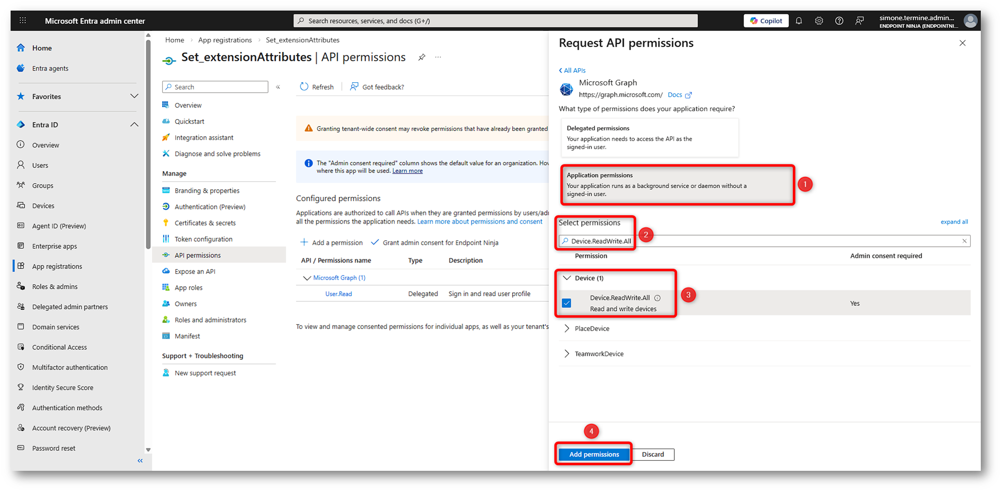 Proseguiamo selezionando Application permissions, nella barra di ricerca “Select permissions” digitiamo Device.ReadWrite.All. Sotto apparirà la sezione Device; espandiamola e selezioniamo la checkbox della permission Device.ReadWrite.All. Infine, facciamo click su Add permissions in fondo alla pagina. Questa permission consente all’applicazione di leggere e modificare tutti gli oggetti device presenti nella directory, operando in modalità app-only (quindi senza un utente interattivo). Nel contesto della demo è il requisito che abilita la chiamata a Microsoft Graph per eseguire la PATCH dell’oggetto e valorizzare extensionAttributes e rendendo l’informazione disponibile per le regole dei gruppi dinamici.