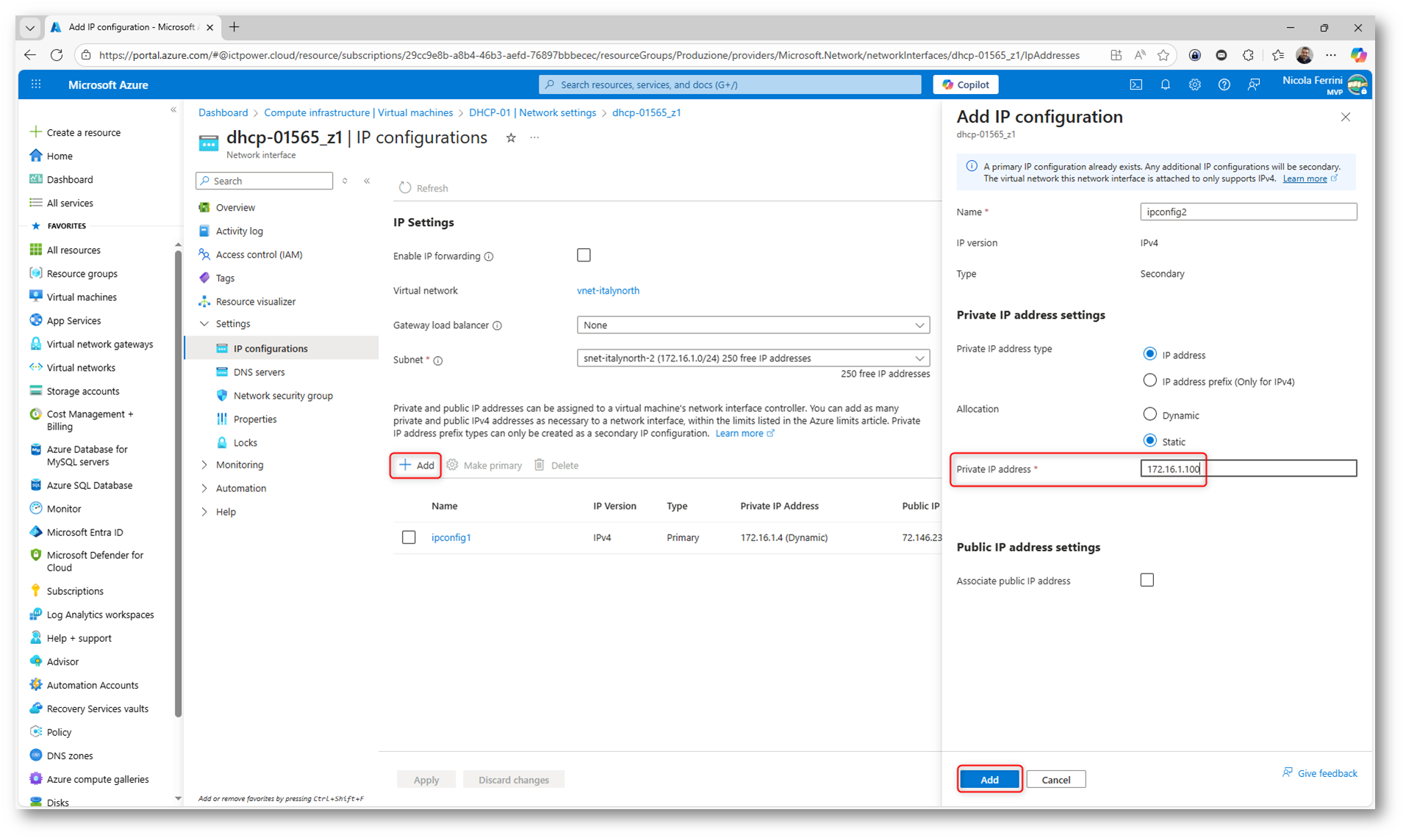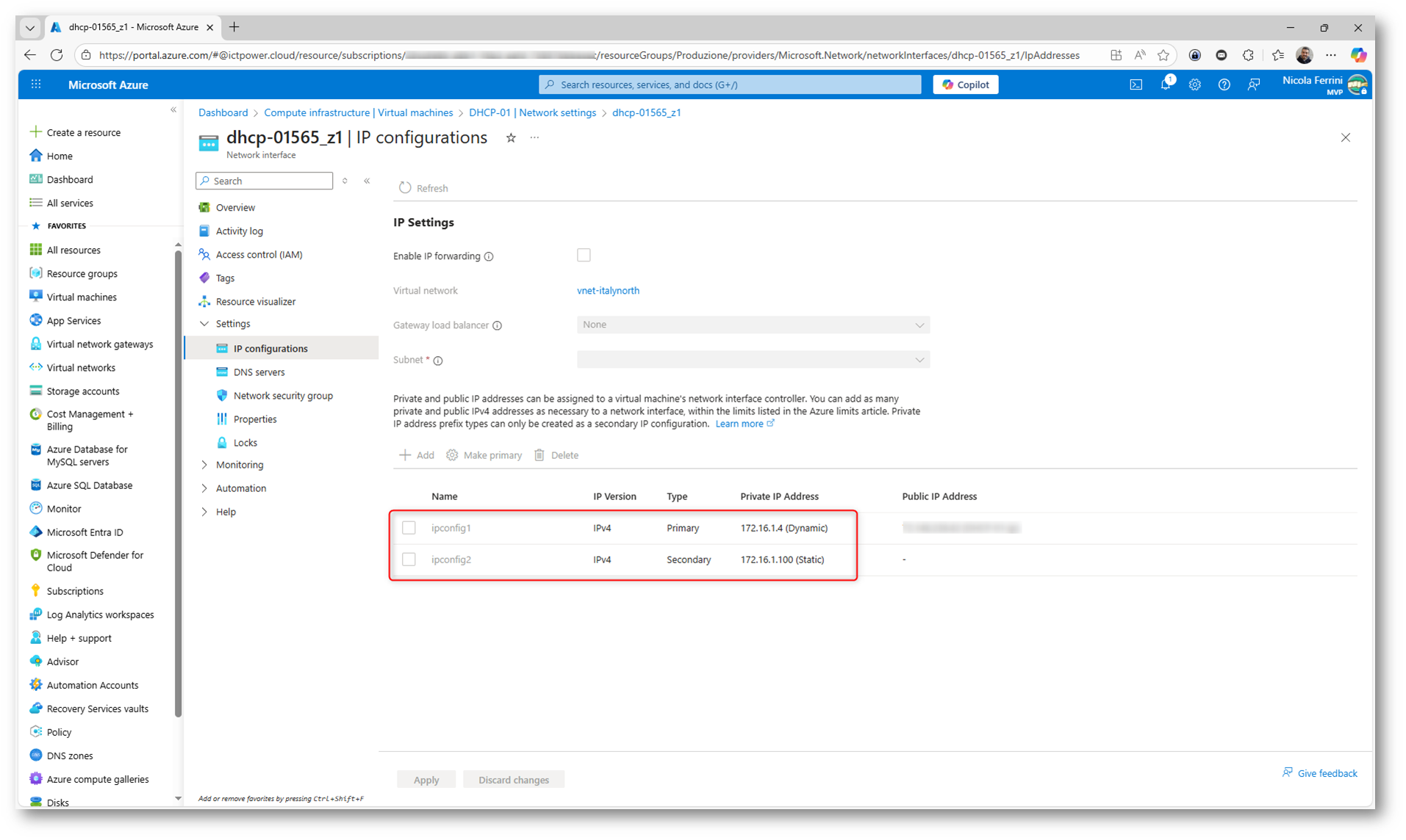 Una volta salvata la configurazione, l’indirizzo IP risulterà associato alla scheda di rete della macchina virtuale come IP secondario. Questo garantisce coerenza tra la configurazione del sistema operativo e quella della piattaforma Azure e permette al servizio DHCP di operare correttamente come destinazione delle richieste inoltrate dal DHCP Relay Agent on-premises.
