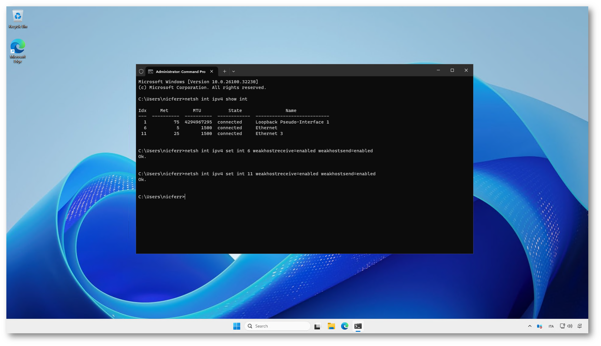 Una volta identificati gli indici corretti, abilitate weakhostreceive e weakhostsend sull’interfaccia di rete primaria eseguendo il comando seguente, sostituendo il valore dell’indice se diverso dal vostro ambiente: netsh int ipv4 set int 6 weakhostreceive=enabled weakhostsend=enabled