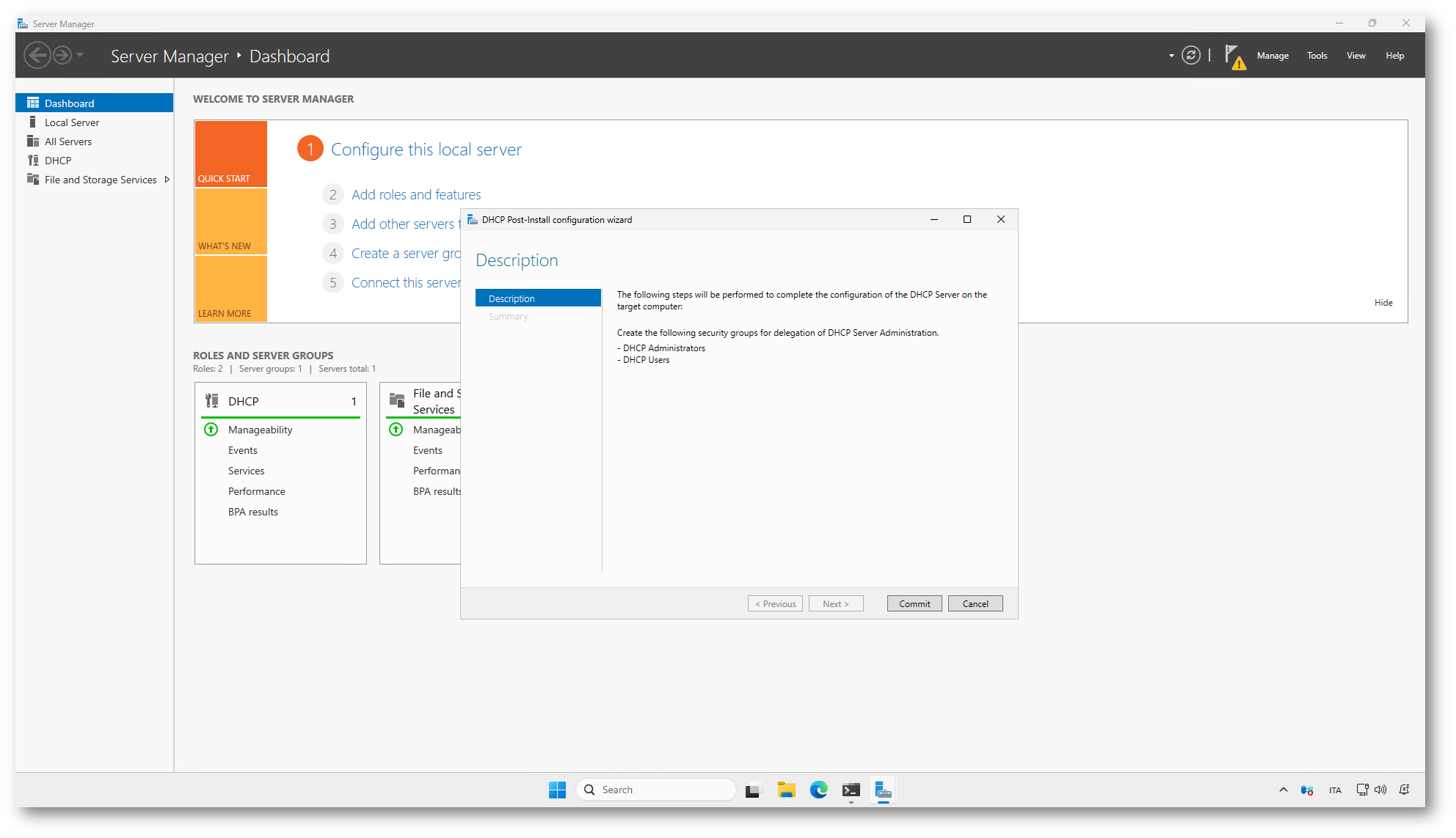 Proseguite con la procedura guidata e confermate le impostazioni proposte fino al completamento della configurazione selezionando Commit. Al termine del processo, il ruolo DHCP risulterà correttamente configurato a livello di sistema operativo.