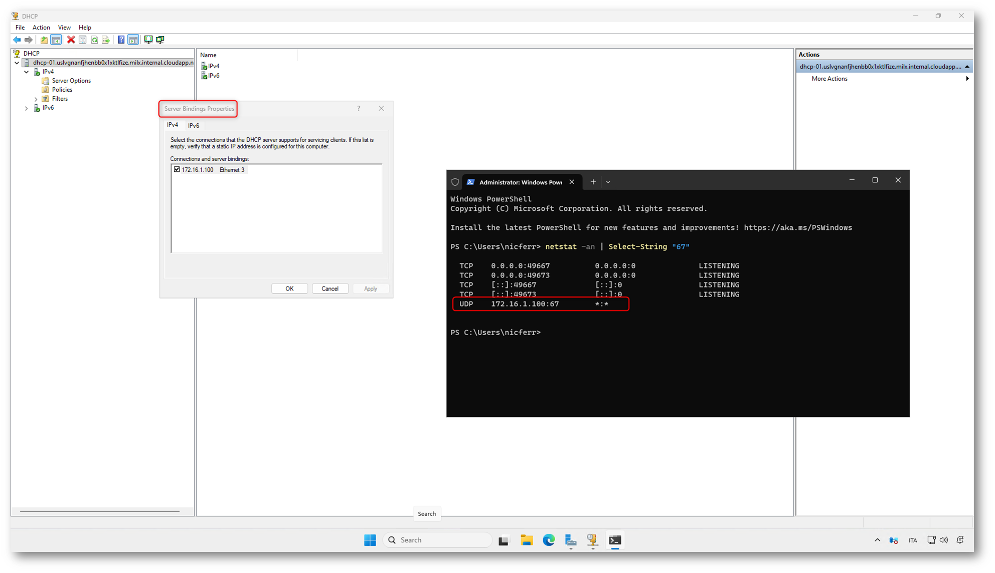 Collegatevi alla macchina virtuale in Azure e aprite una sessione PowerShell con privilegi amministrativi. Una volta aperta la console, eseguite il comando seguente per verificare su quali indirizzi IP il servizio DHCP sta ascoltando: netstat -an | Select-String “67”