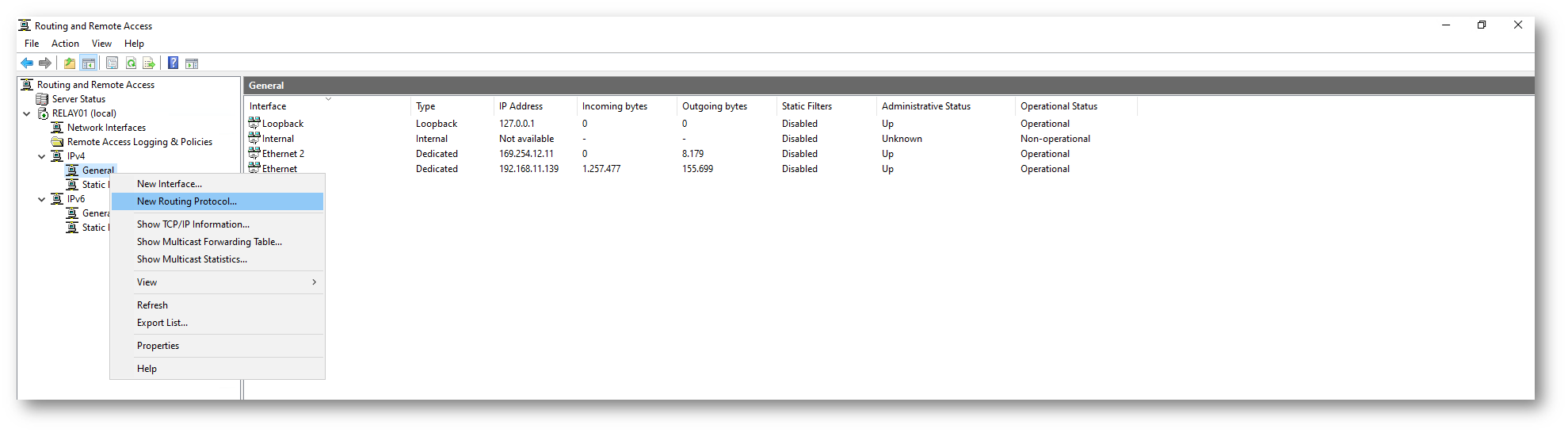Dopo l’avvio del servizio, espandete il nodo IP Routing e selezionate General. Da qui, aprite il pannello New Routing Protocol e aggiungete il protocollo DHCP Relay Agent all’elenco dei protocolli di routing disponibili.