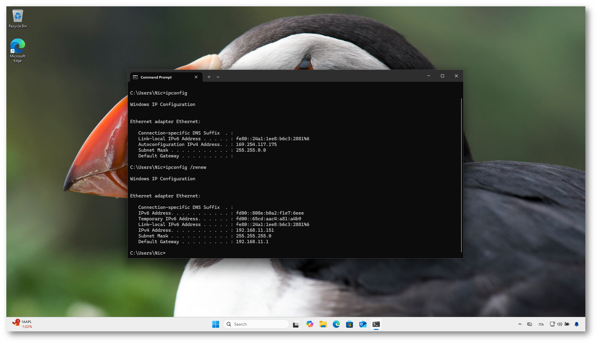 Dopo aver collegato la macchina alla rete, ho forzato il rinnovo della configurazione DHCP eseguendo il comando: ipconfig /renew