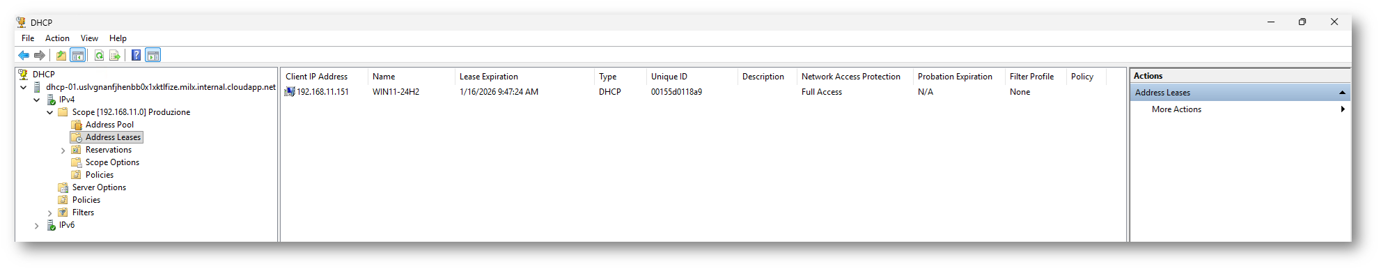 La schermata sotto mostra la console di gestione del server DHCP in esecuzione nella macchina virtuale Azure e rappresenta la conferma finale del corretto funzionamento del servizio dal punto di vista del server. Nel caso specifico, il server DHCP ha assegnato correttamente l’indirizzo IP 192.168.11.151 al client on-premises WIN11-24H2.