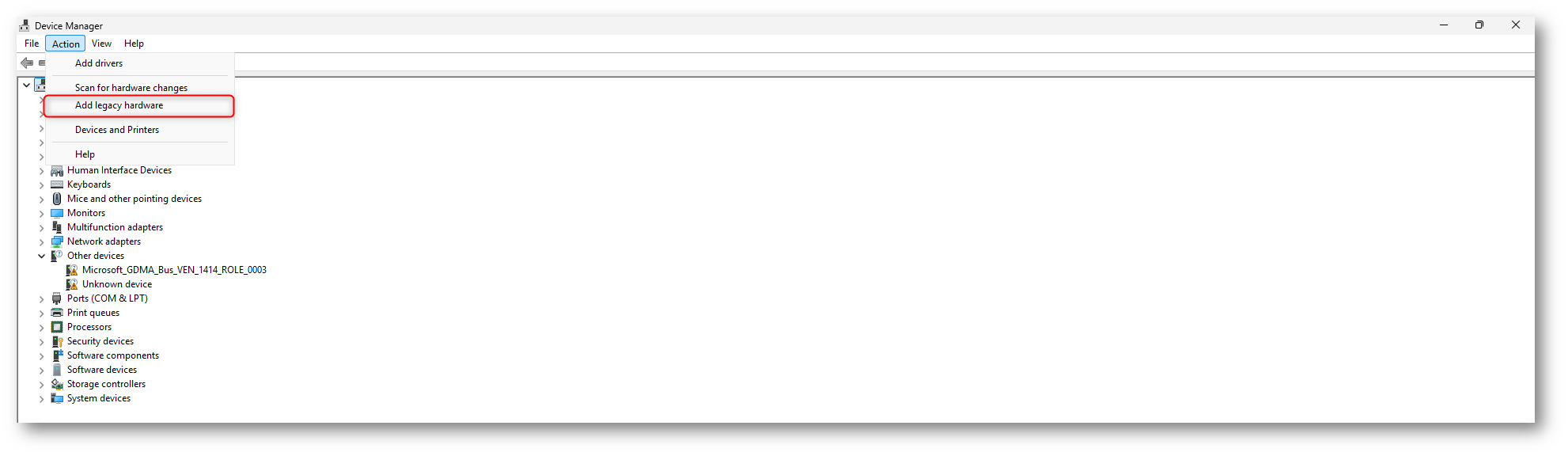 Accedete alla macchina virtuale Azure e aprite Device Manager. Una volta aperto, selezionate il nome del computer visualizzato nella parte superiore dell’elenco dei dispositivi. Dal menu principale, scegliete Action e quindi Add legacy hardware per avviare l’Add Hardware Wizard.