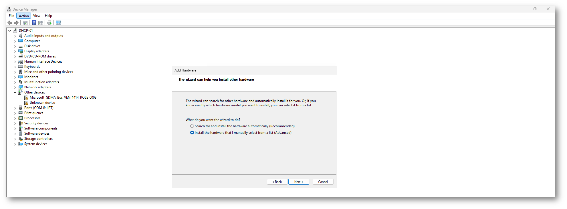 Nella schermata iniziale della procedura guidata, selezionate Next, quindi scegliete l’opzione Install the hardware that I manually select from a list (Advanced) e proseguite nuovamente con Next.