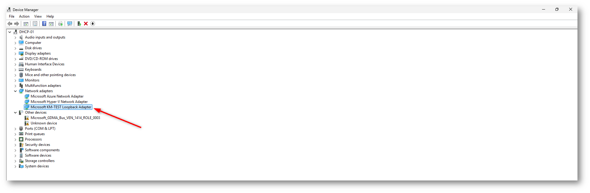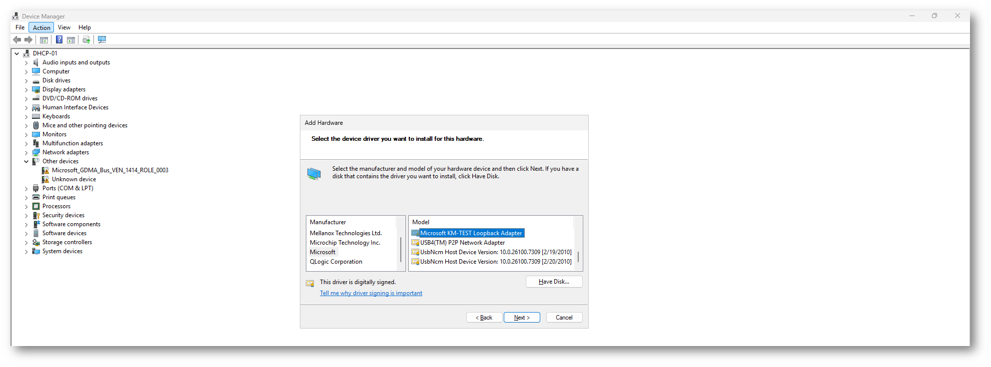 Figura 6: Scelta del Microsoft KM-TEST Loopback Adapter