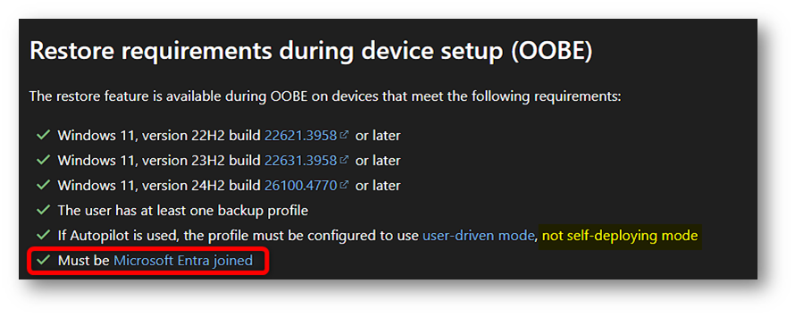 indica che il restore può essere avviato sia durante OOBE sia al primo accesso dopo il completamento dell’enrollment e, per questo secondo scenario, riporta supporto anche per dispositivi Microsoft Entra Hybrid joined.