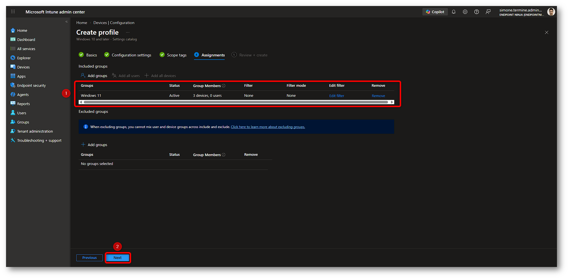 Nella stessa sezione Assignments verifichiamo che il gruppo selezionato sia stato aggiunto correttamente all’elenco Included groups. Se necessario, possiamo ancora aggiungere altri gruppi o applicare eventuali filtri; altrimenti proseguiamo cliccando nuovamente su Next.