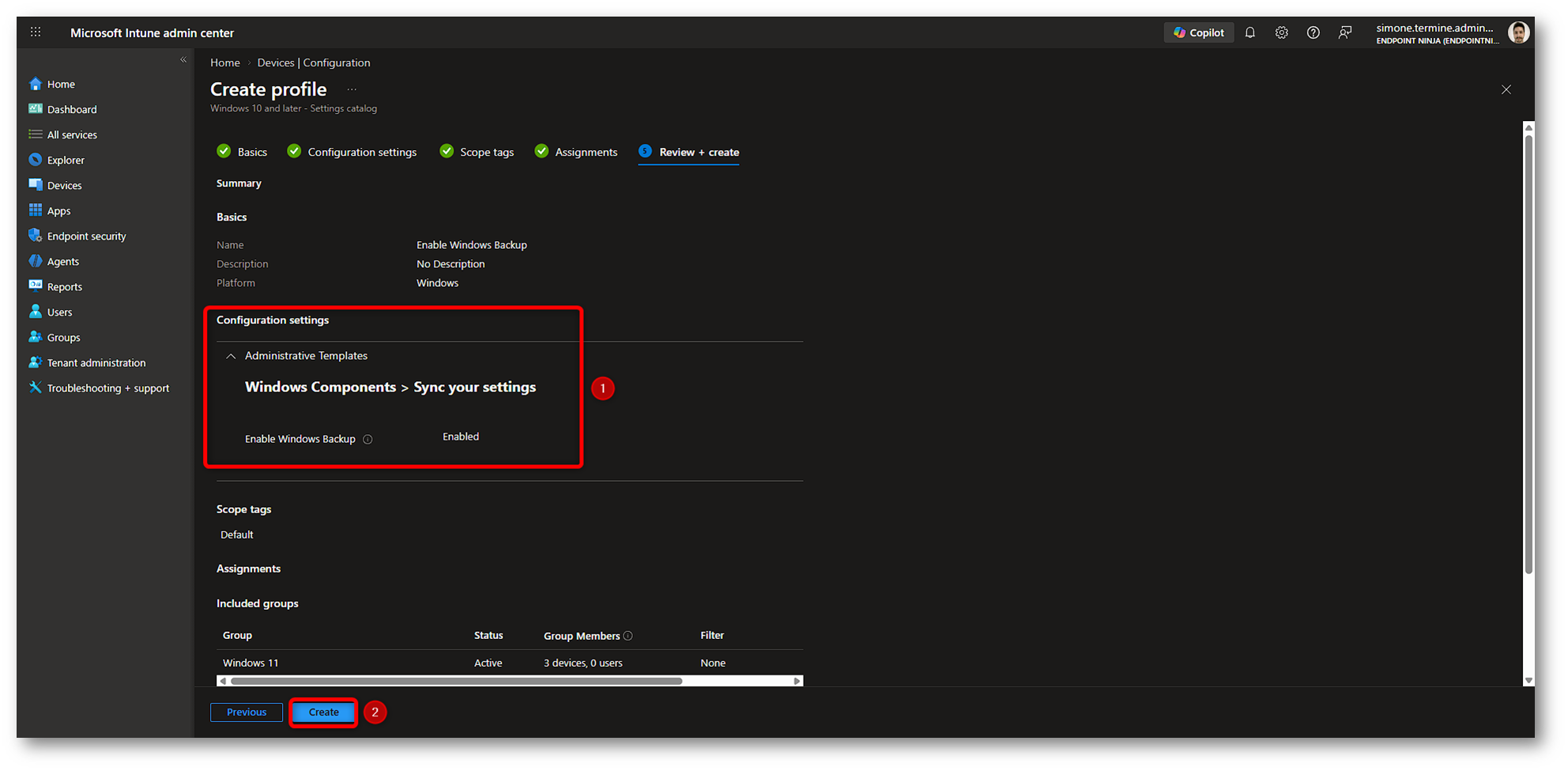 Figura 12: Creazione policy Windows Backup in Microsoft Intune – Parte 8