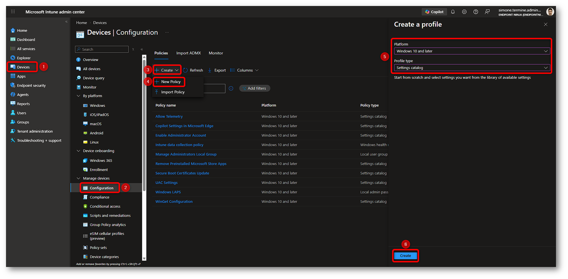 Per creare questa policy, apriamo il Microsoft Intune admin center, andiamo in Devices > Configuration e creiamo un nuovo profilo scegliendo Windows 10 and later come piattaforma e Settings Catalog come tipo di profilo.