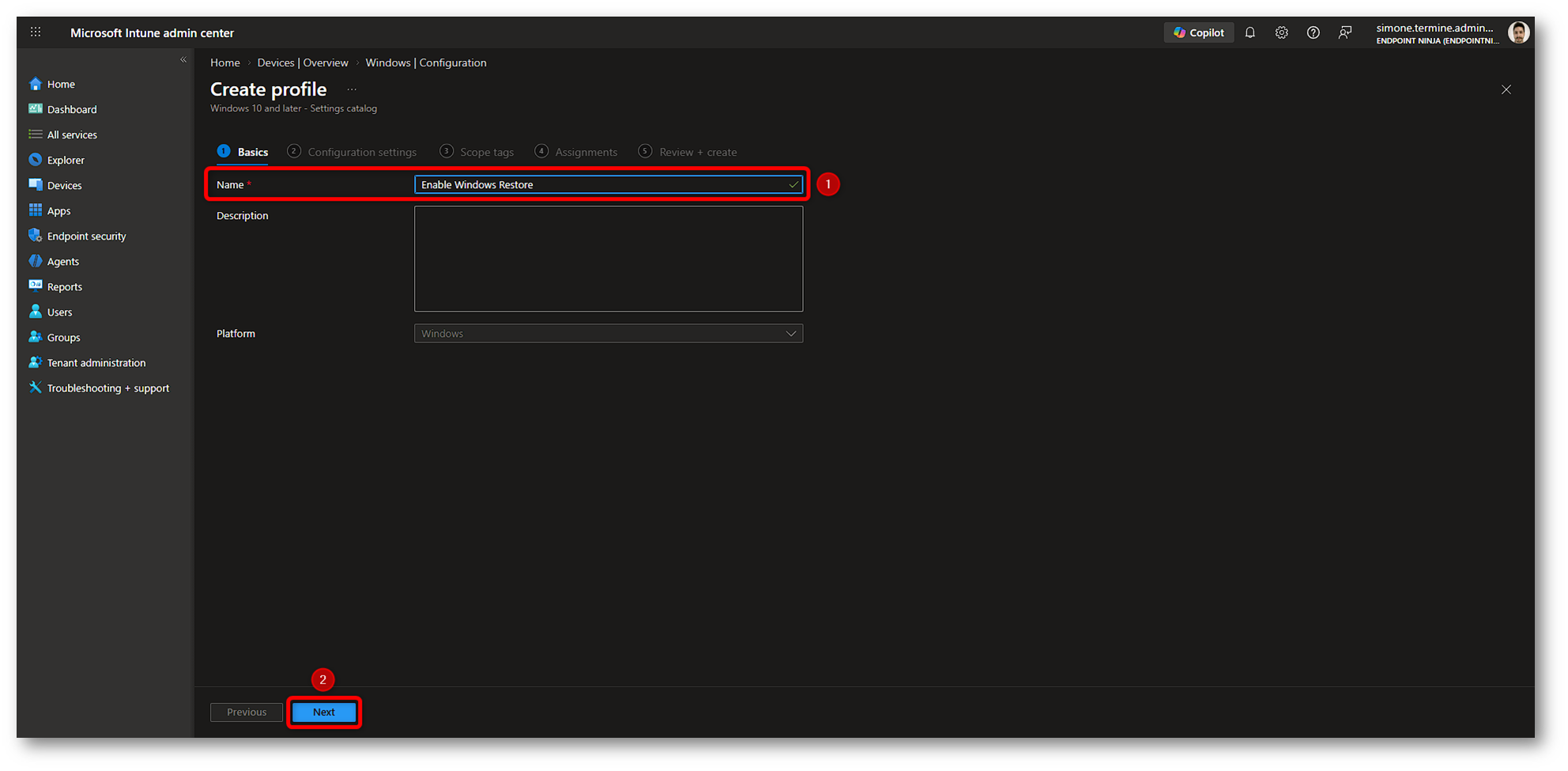 Figura 14: Creazione policy Windows Restore in Microsoft Intune – Parte 1