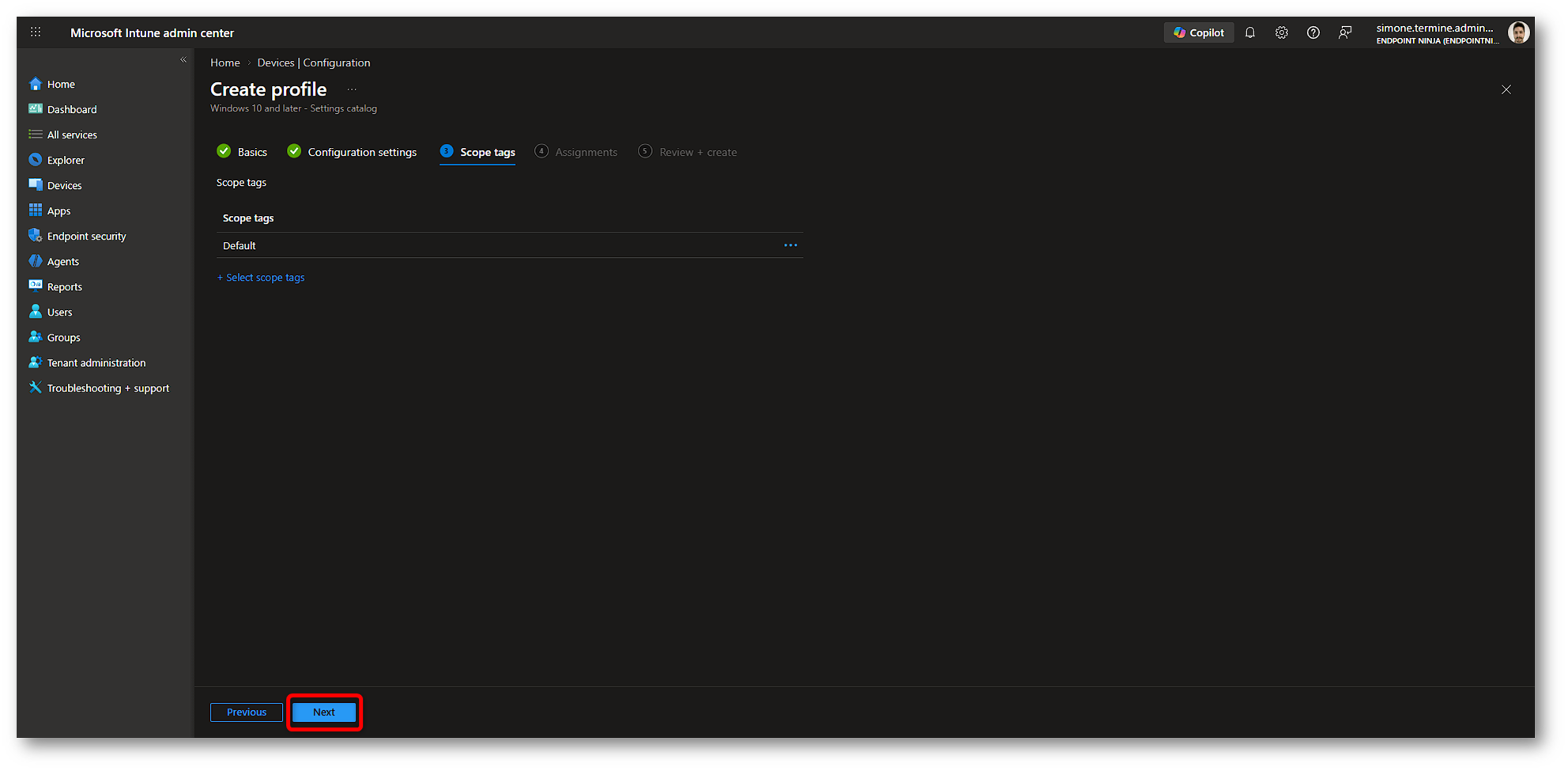 Nella sezione Scope tags (opzionale) possiamo lasciare il valore Default oppure selezionare uno scope tag già presente nel nostro ambiente Intune. Nel nostro caso lasciamo quello predefinito e proseguiamo cliccando su Next.